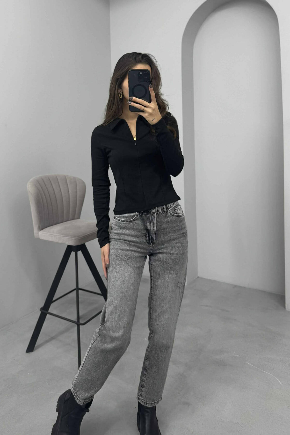 ONE COLOR FLUFFY POLO NECK WOMEN SWEATSHIRT DARK GREY/GEE