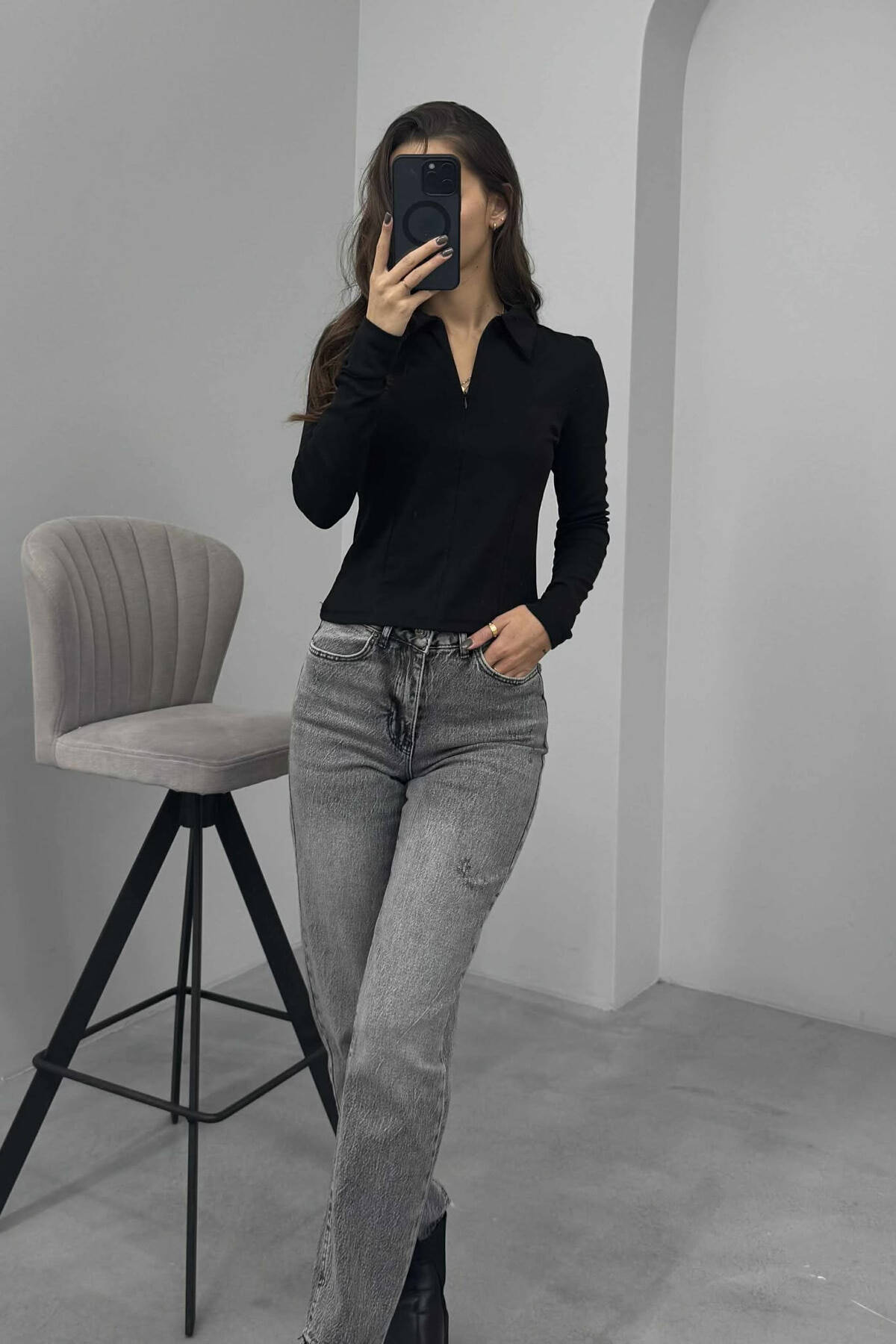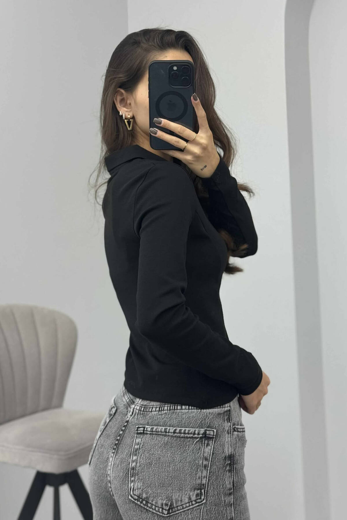 ONE COLOR FLUFFY POLO NECK WOMEN SWEATSHIRT BLACK/ E ZEZE