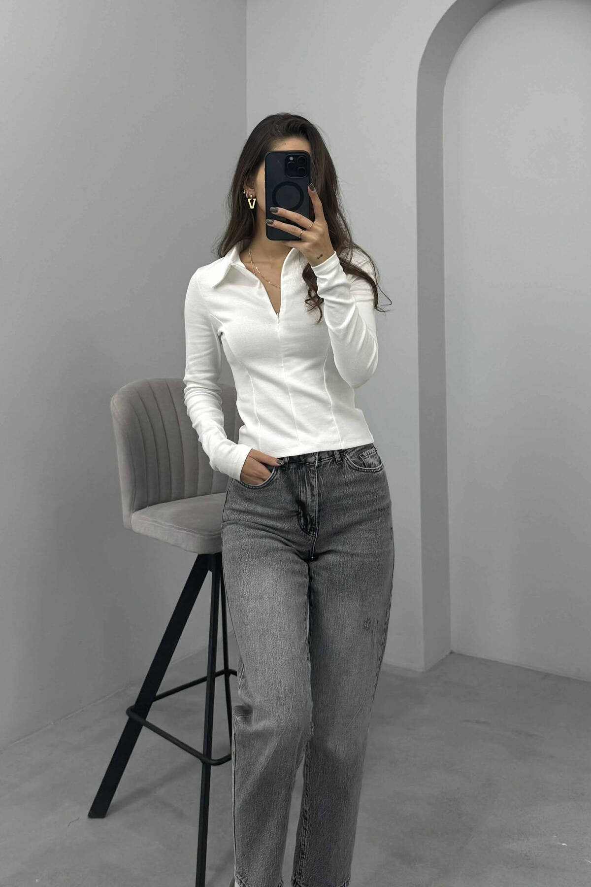 ONE COLOR FLUFFY POLO NECK WOMEN SWEATSHIRT DARK GREY/GEE