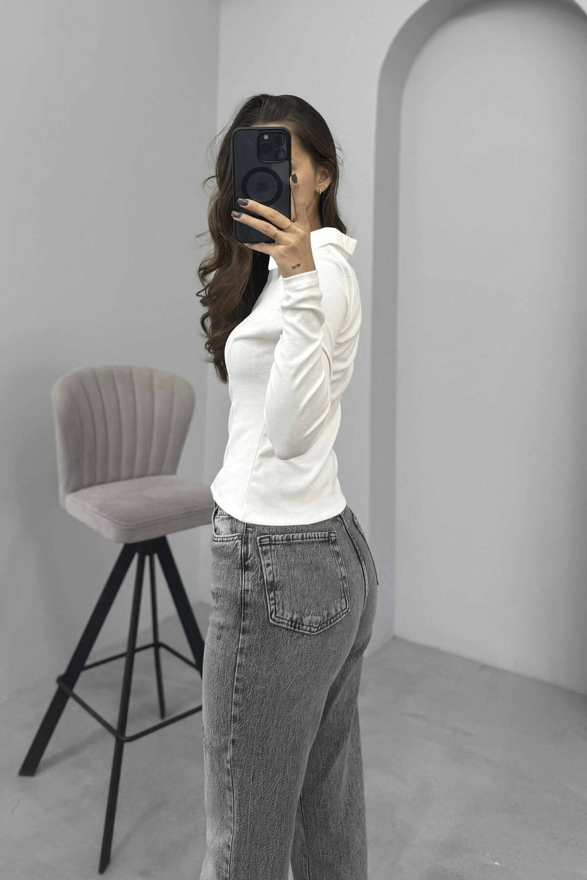 ONE COLOR FLUFFY POLO NECK WOMEN SWEATSHIRT GREY/GRI