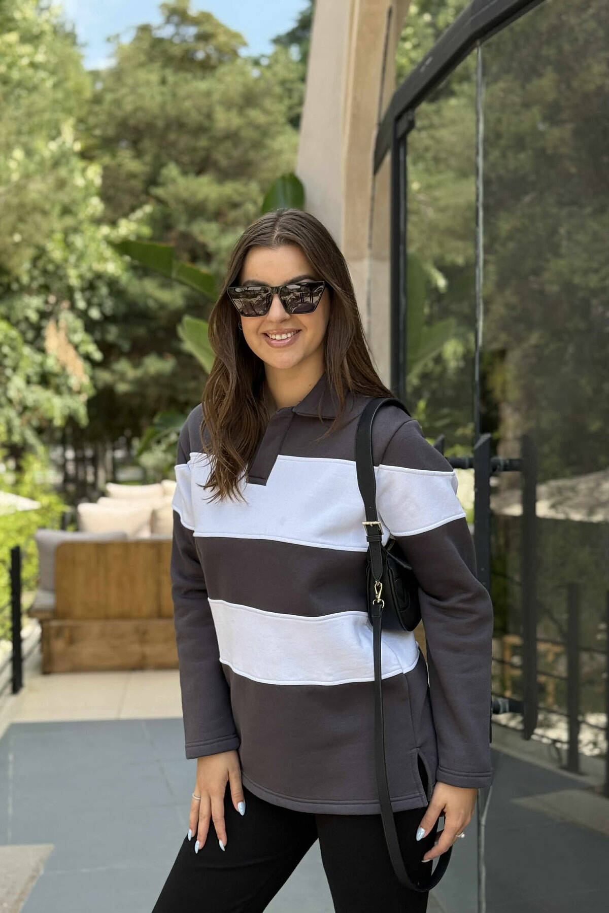 POLO NECK STRIPE DESIGN FLUFFY WOMEN SWEATSHIRT DARK GREY/GEE