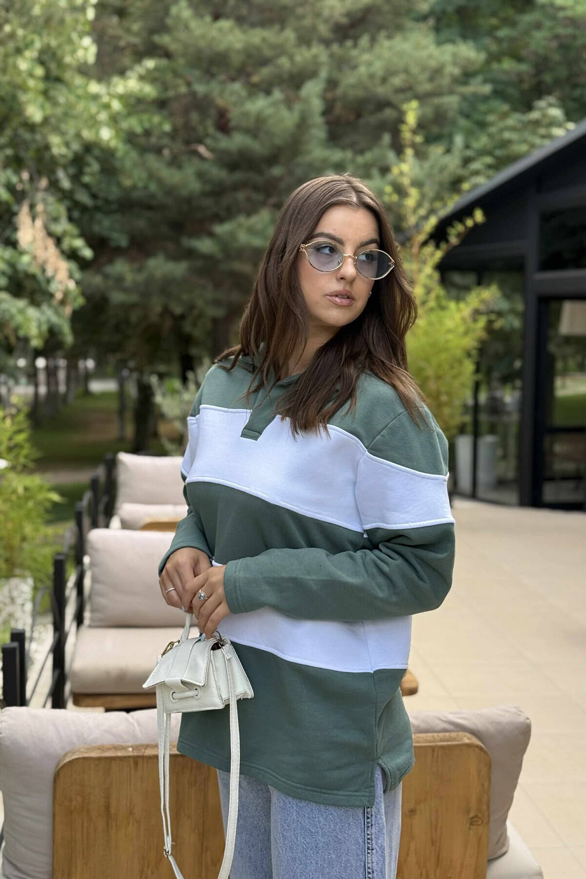 POLO NECK STRIPE DESIGN FLUFFY WOMEN SWEATSHIRT GREEN/JESHILE