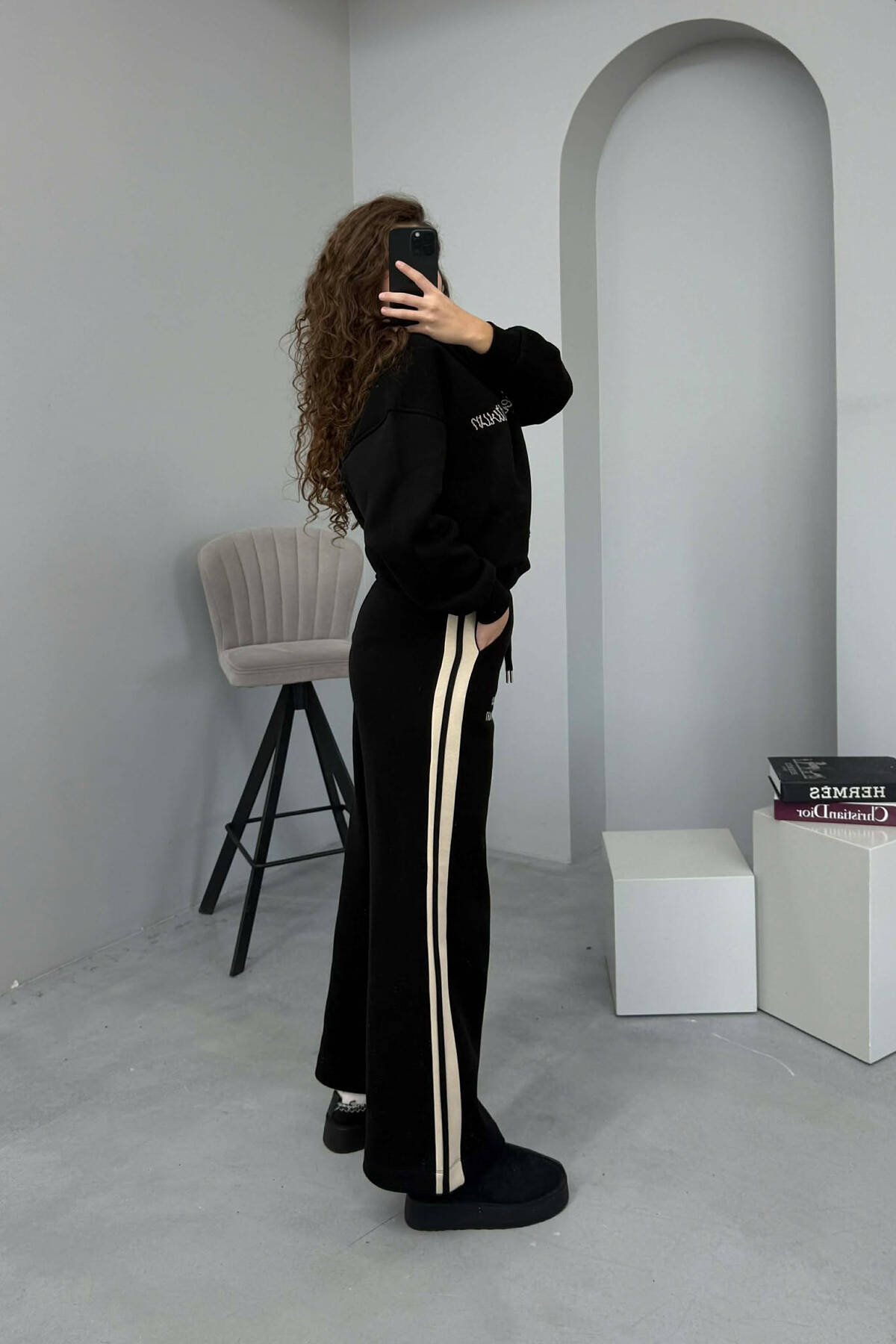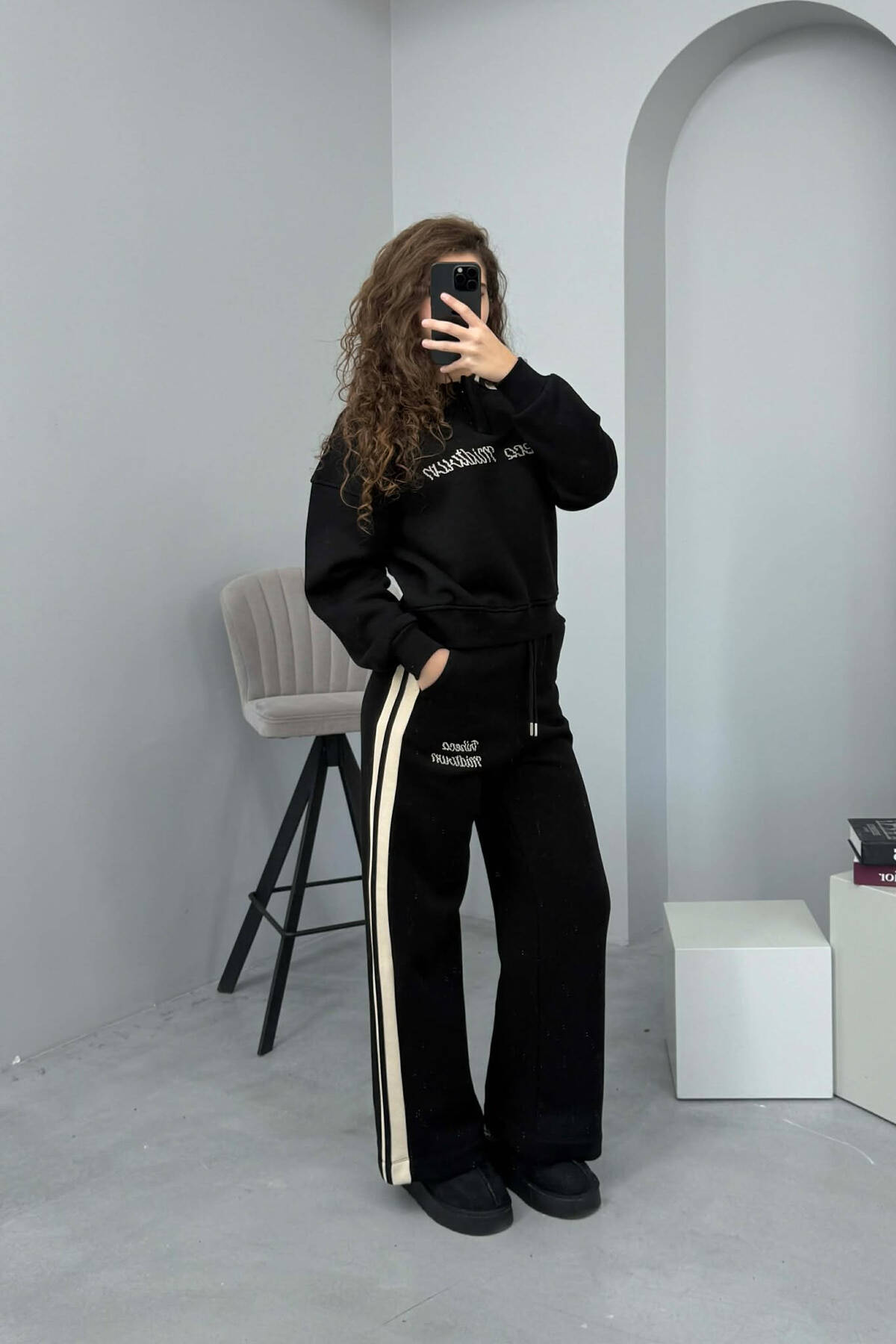 POLO NECK SWEATSHIRT+SWEATPANTS FLUFFY WOMEN SET BLACK/ E ZEZE