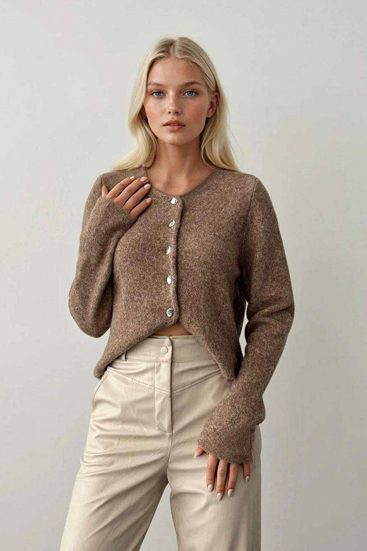 PULOVER NJE NGJYRESHE ME BUTONA GOLD PER FEMRA NE NGJYRE KAFE