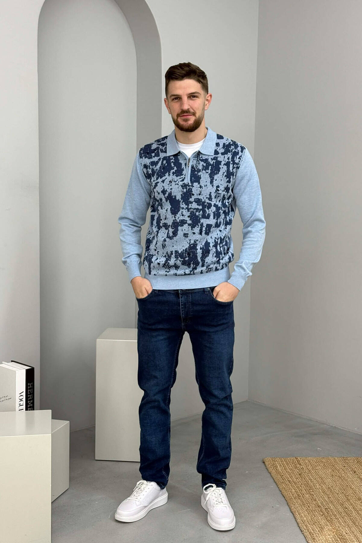 PULOVËR ME JAKË POLO DHE ME DETAJIN E ZINXHIRIT PËR MESHKUJ NË NGJYRËN BLU