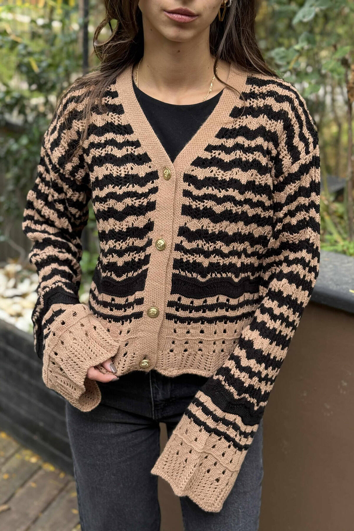 PULOVËR ME VIJA DHE KOPSA GOLD PËR FEMRA NË NGJYRË TË ZEZË ME KAFE