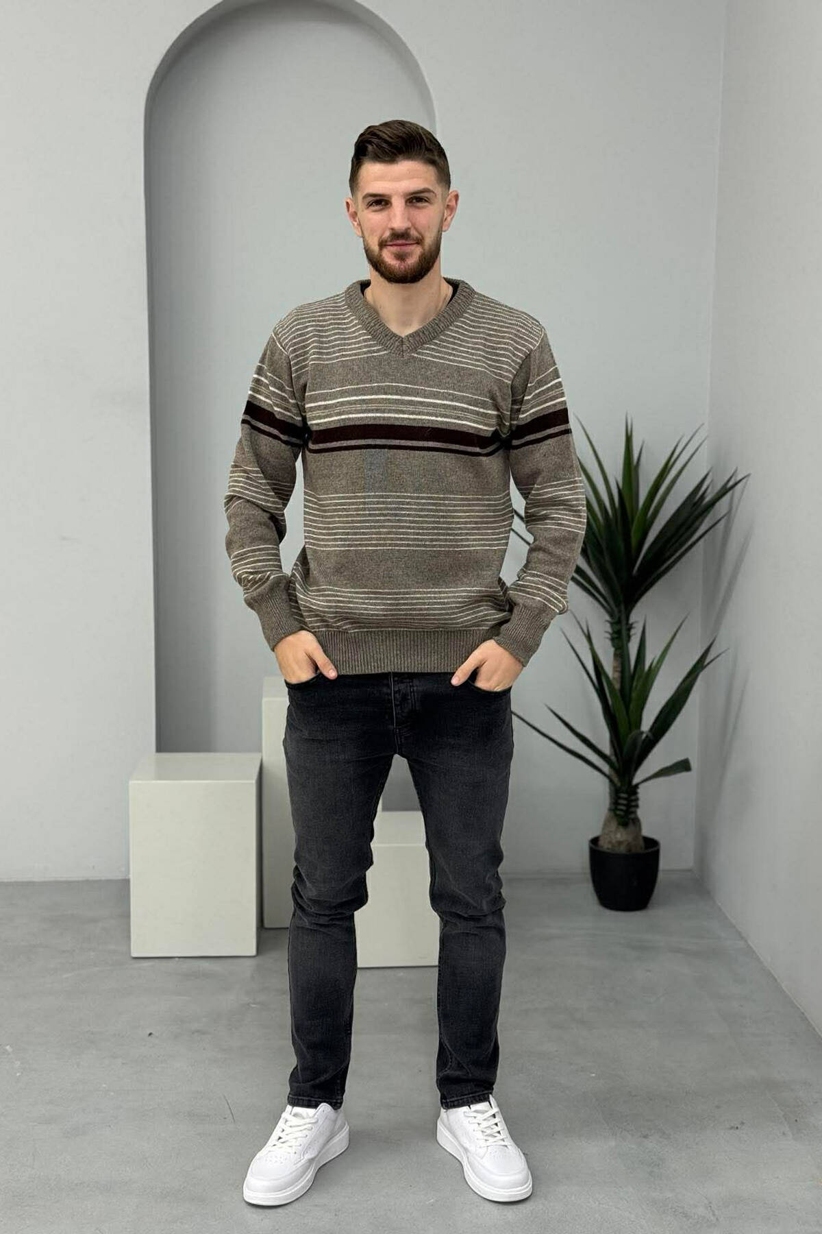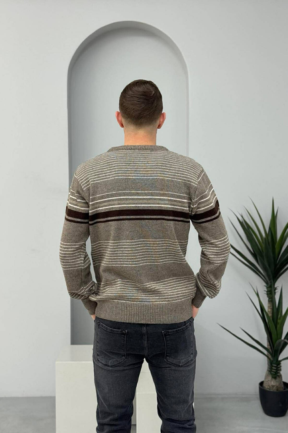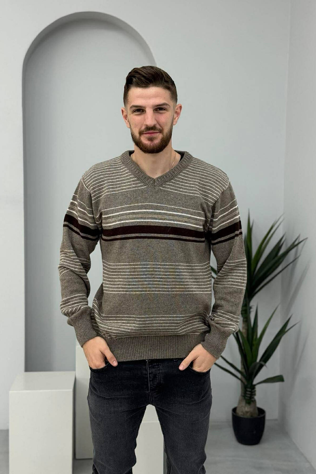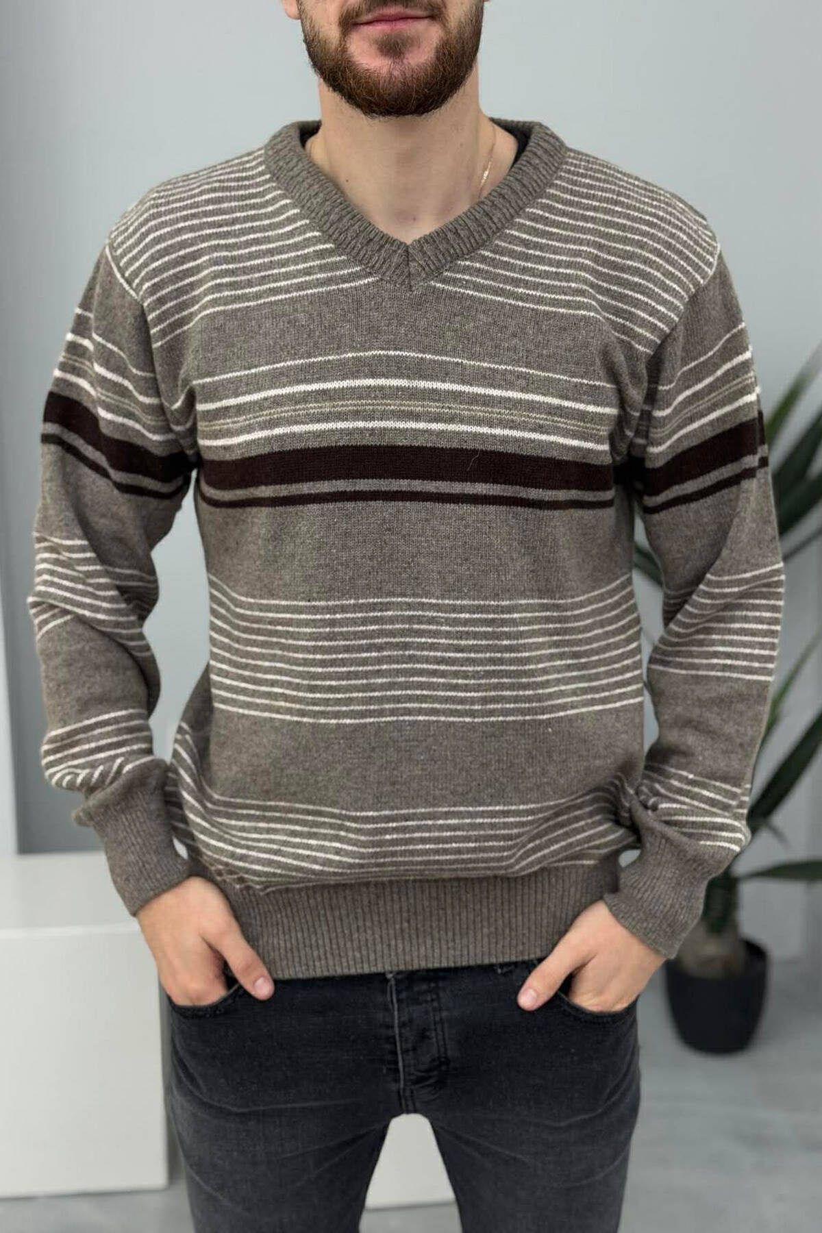 PULOVËR ME VIJA PËR MESHKUJ NË NGJYRËN KAFE E ZBARDHUR