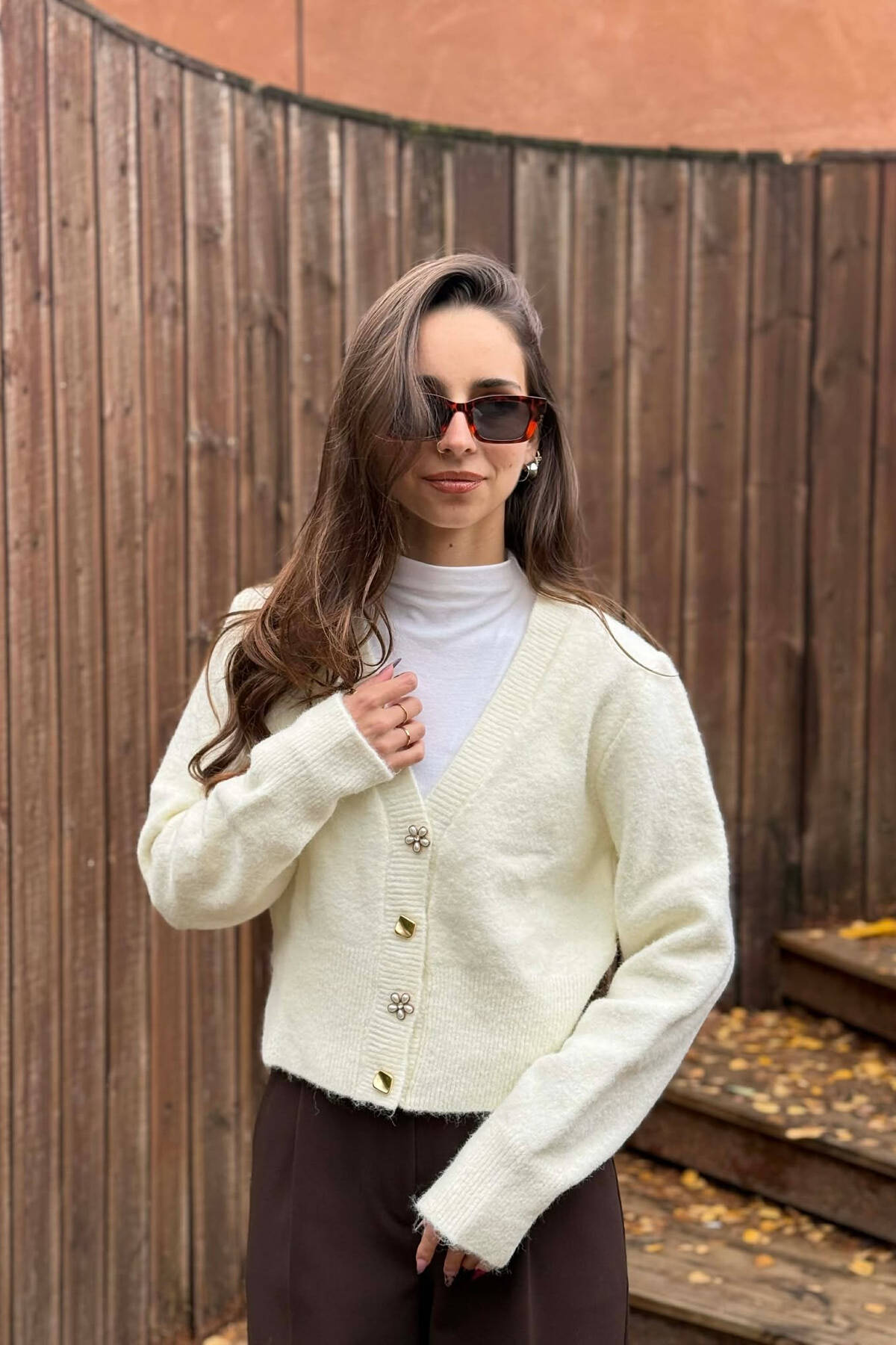 PULOVËR NJË NGJYRËSHE ME BUTONA PËR FEMRA NË NGJYRË KREM