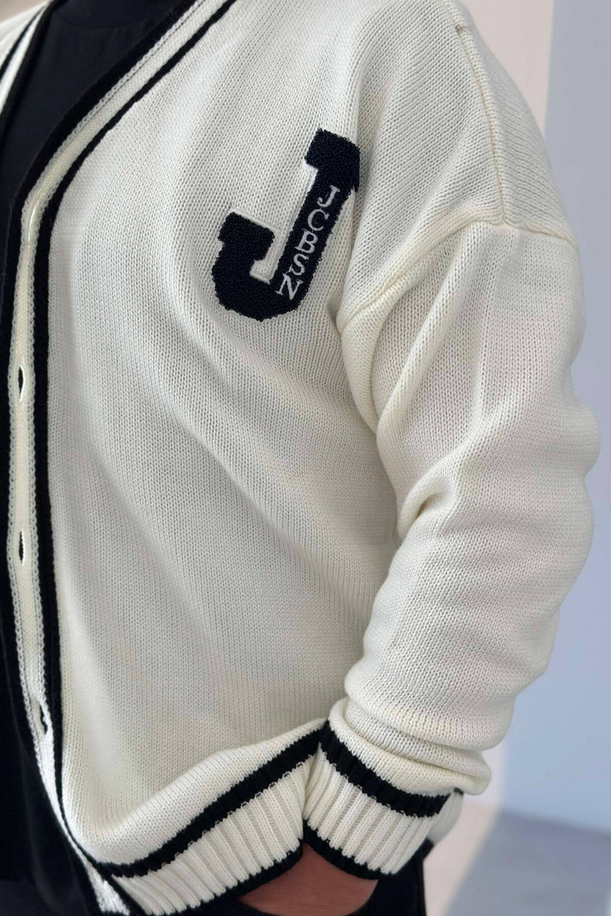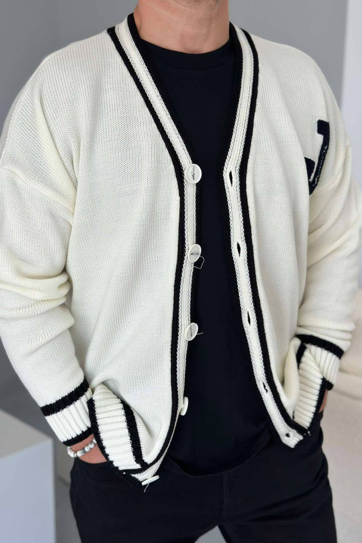 Pulovrër për meshkuj me mbërthim me kopsa , vjen me dizenjot e vijave dhe të një shkronje anash .E thjeshtë për kombinim dhe me një super material cilësor , do tju mbajë gjithashtu ngrohtë në ditët e ftohta.