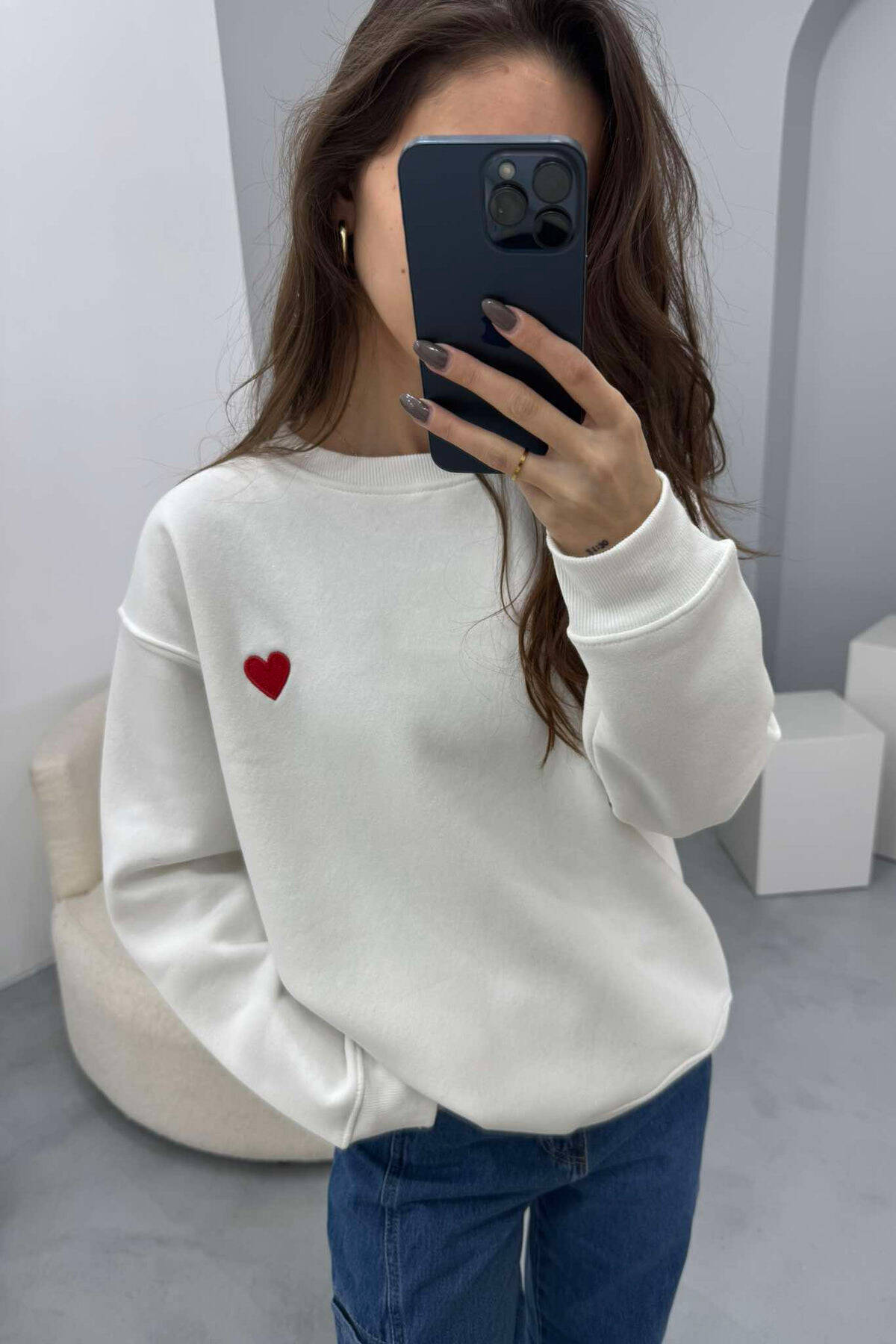 ROUND NECK HEART DETAIL WOMEN SWEATSHIRT WHITE-E BARDHE