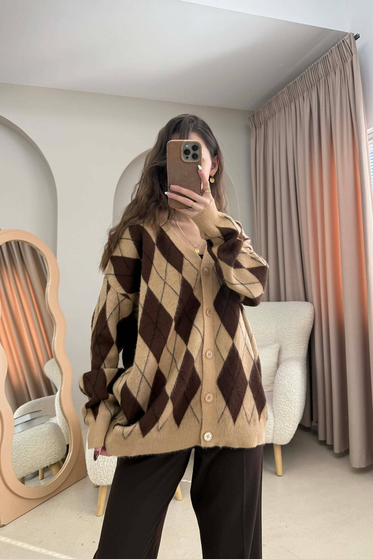 RHOMBUS DESIGN BUTTONED WOMEN CARDIGAN BROWN/KAFE
