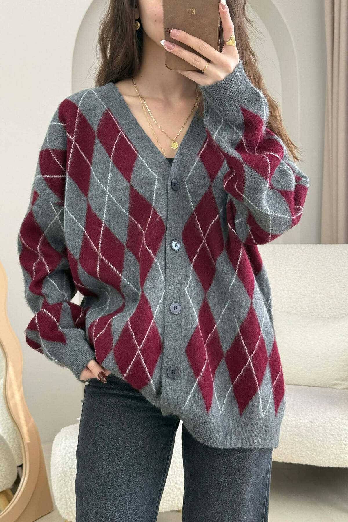 RHOMBUS DESIGN BUTTONED WOMEN CARDIGAN GREY/GRI