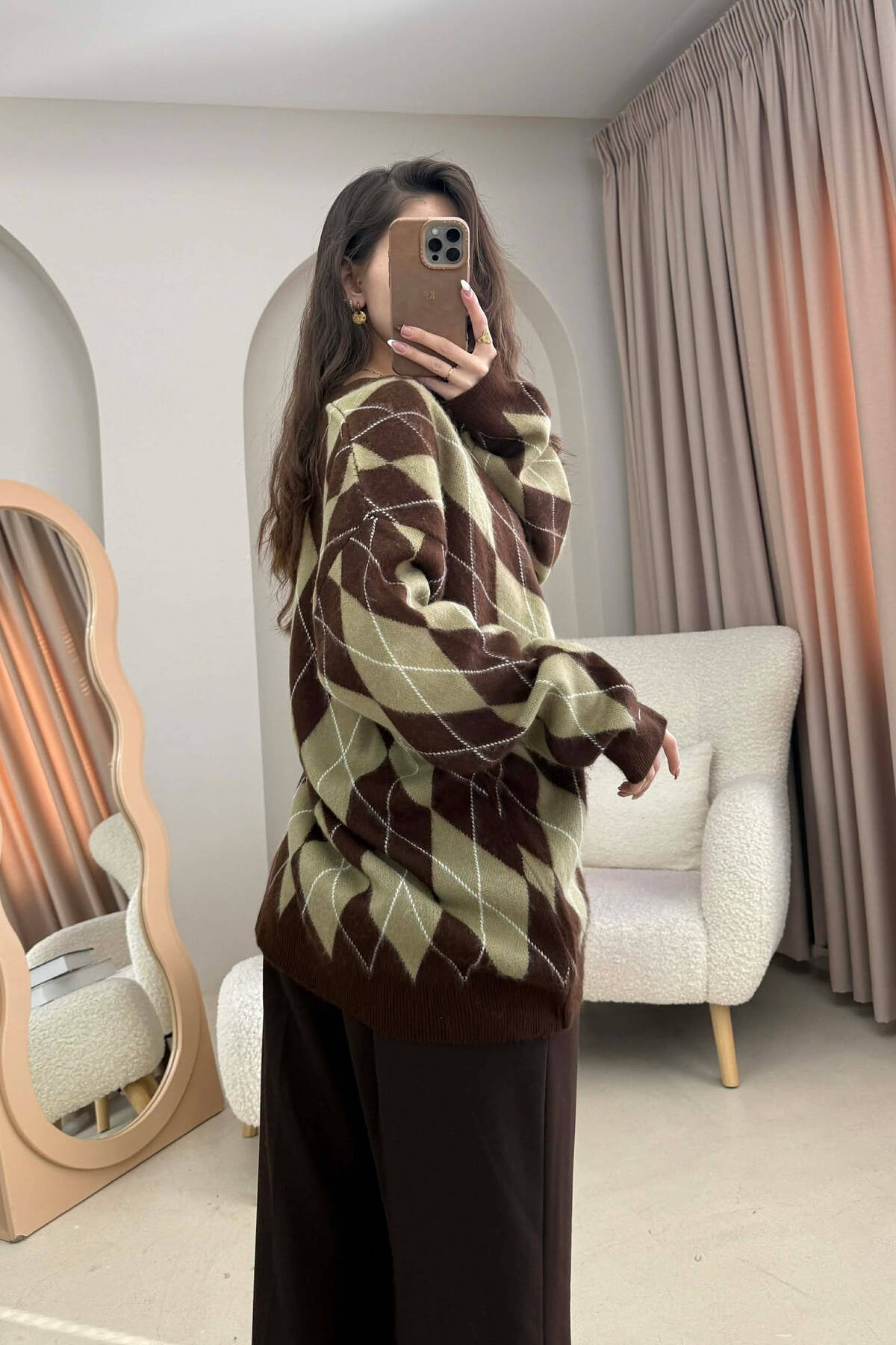 RHOMBUS DESIGN BUTTONED WOMEN CARDIGAN BROWN/KAFE