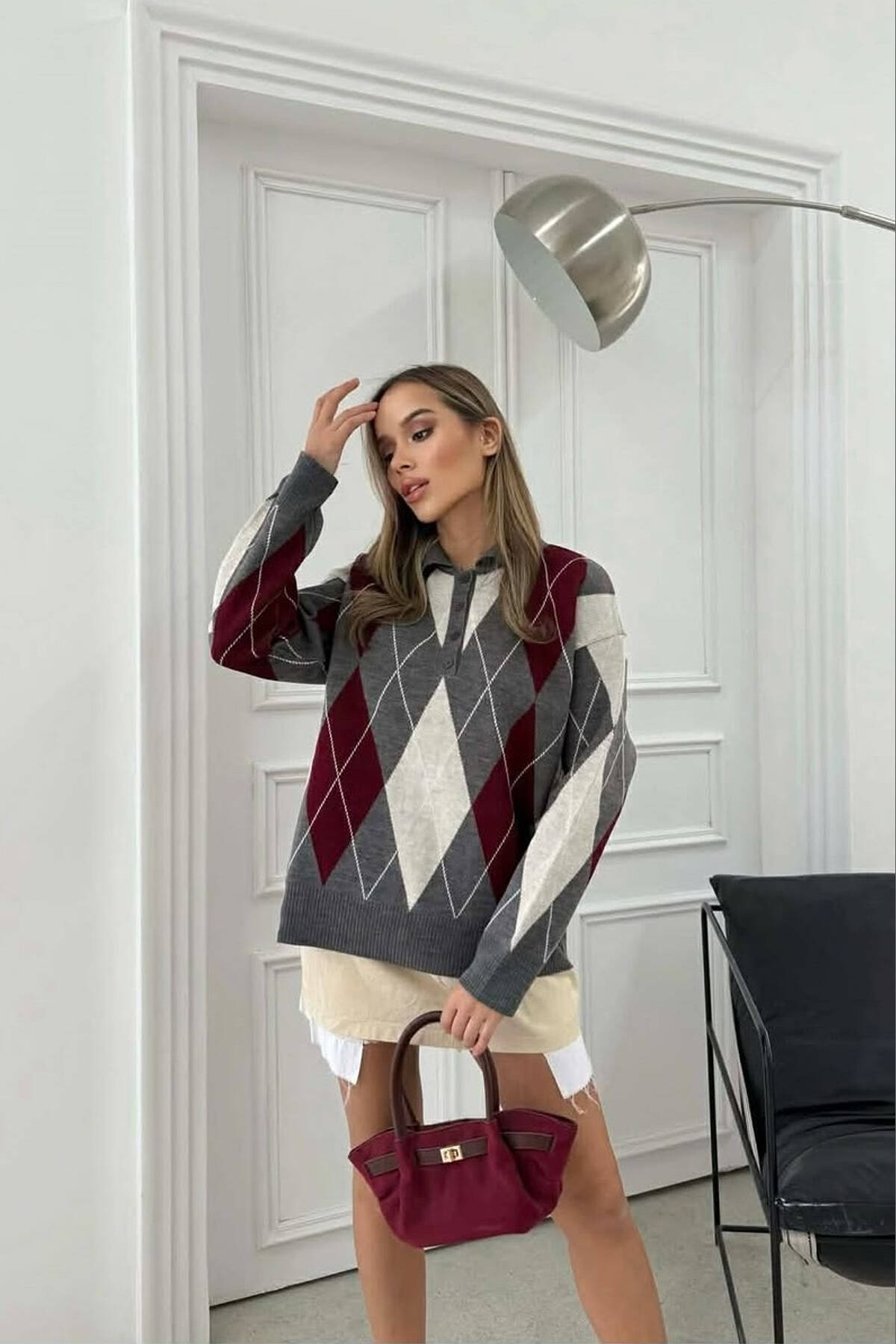 RHOMBUS DESIGN POLO BUTTONED NECK WOMEN SWEATER GREY/GRI