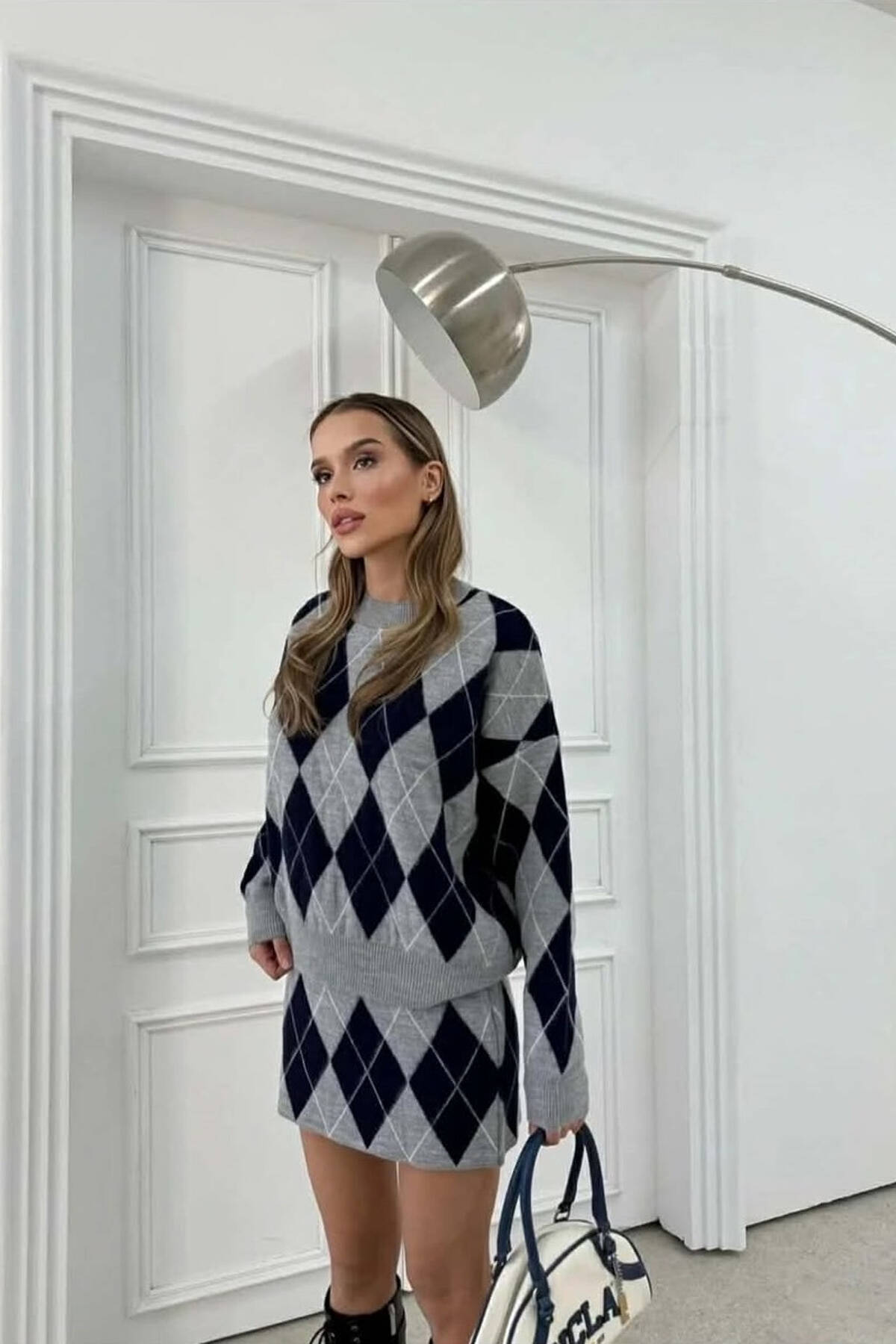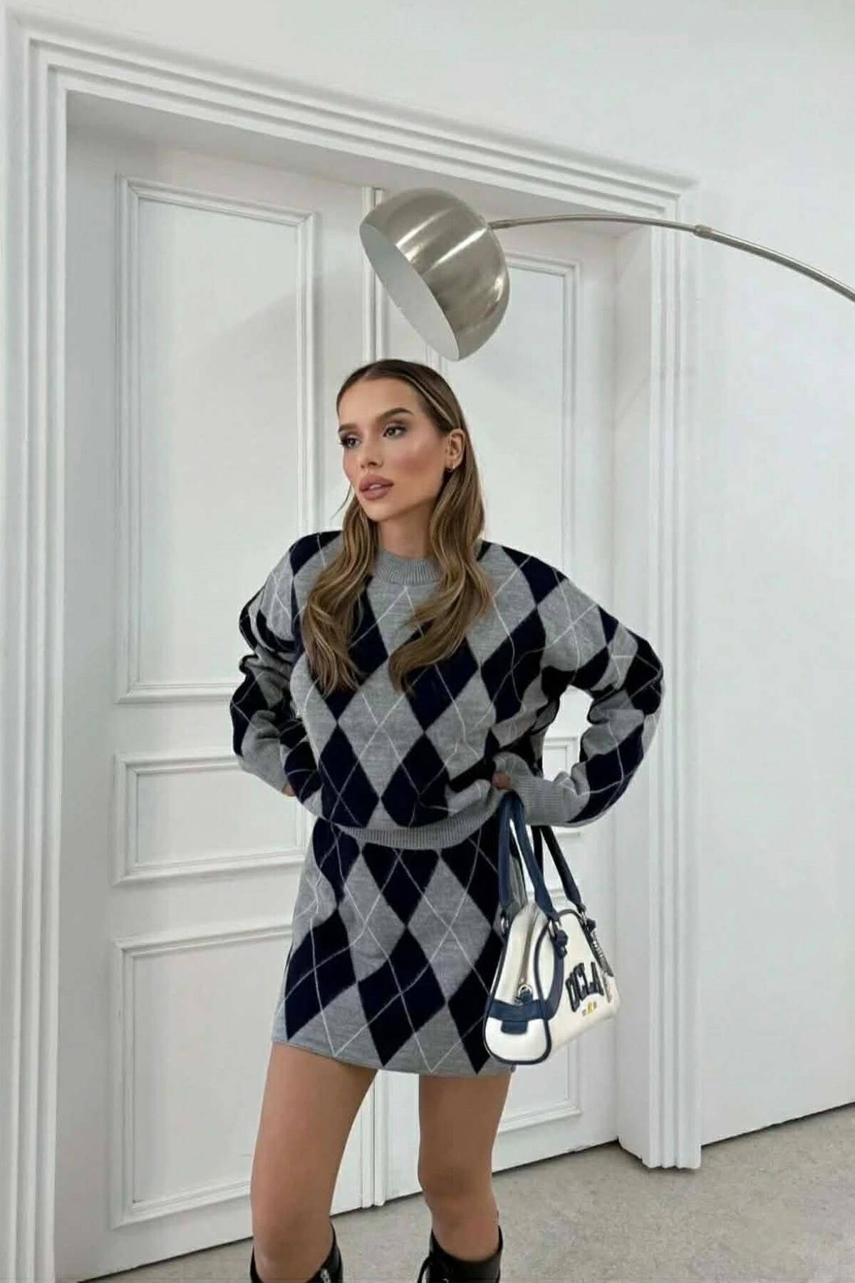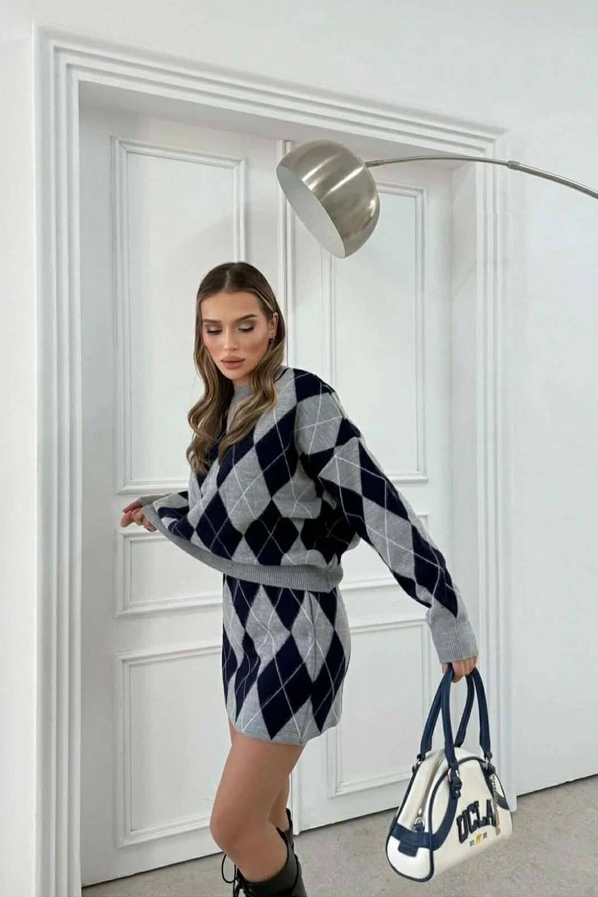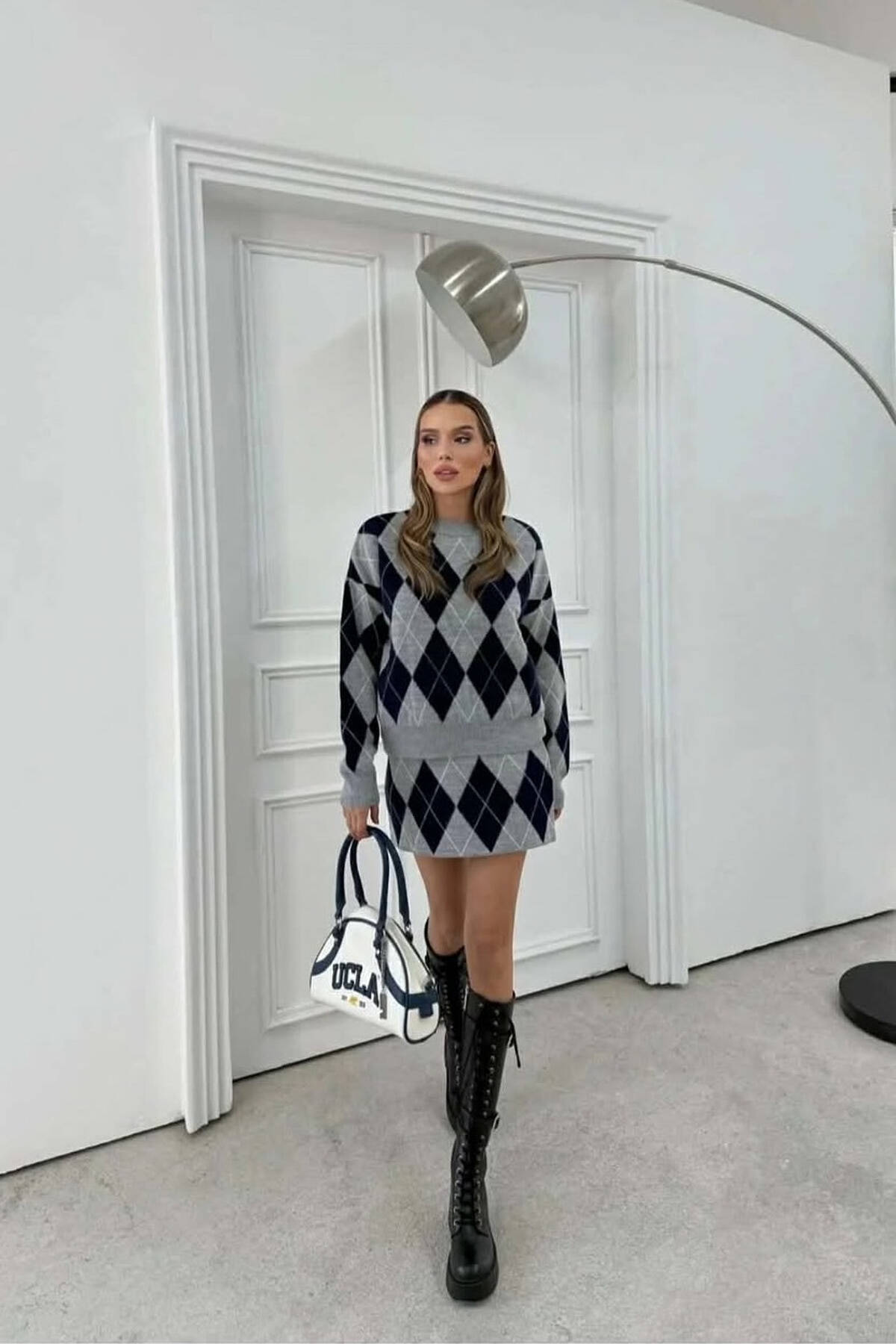 RHOMBUS DESIGN SWEATER+SKIRT WOMEN SET LIGHT GREY/GZ