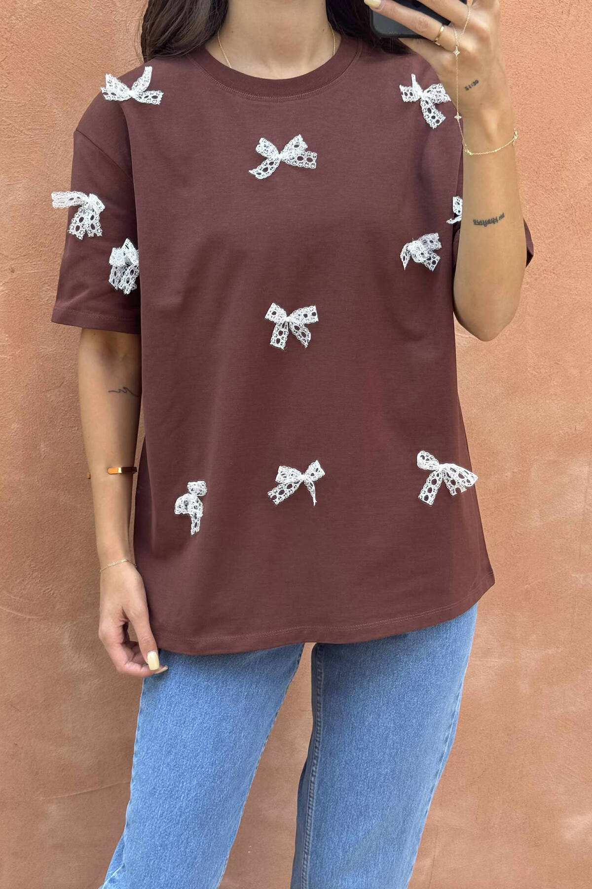 RIBBON DETAILS ONE COLOR WOMEN T-SHIRT BROWN/KAFE