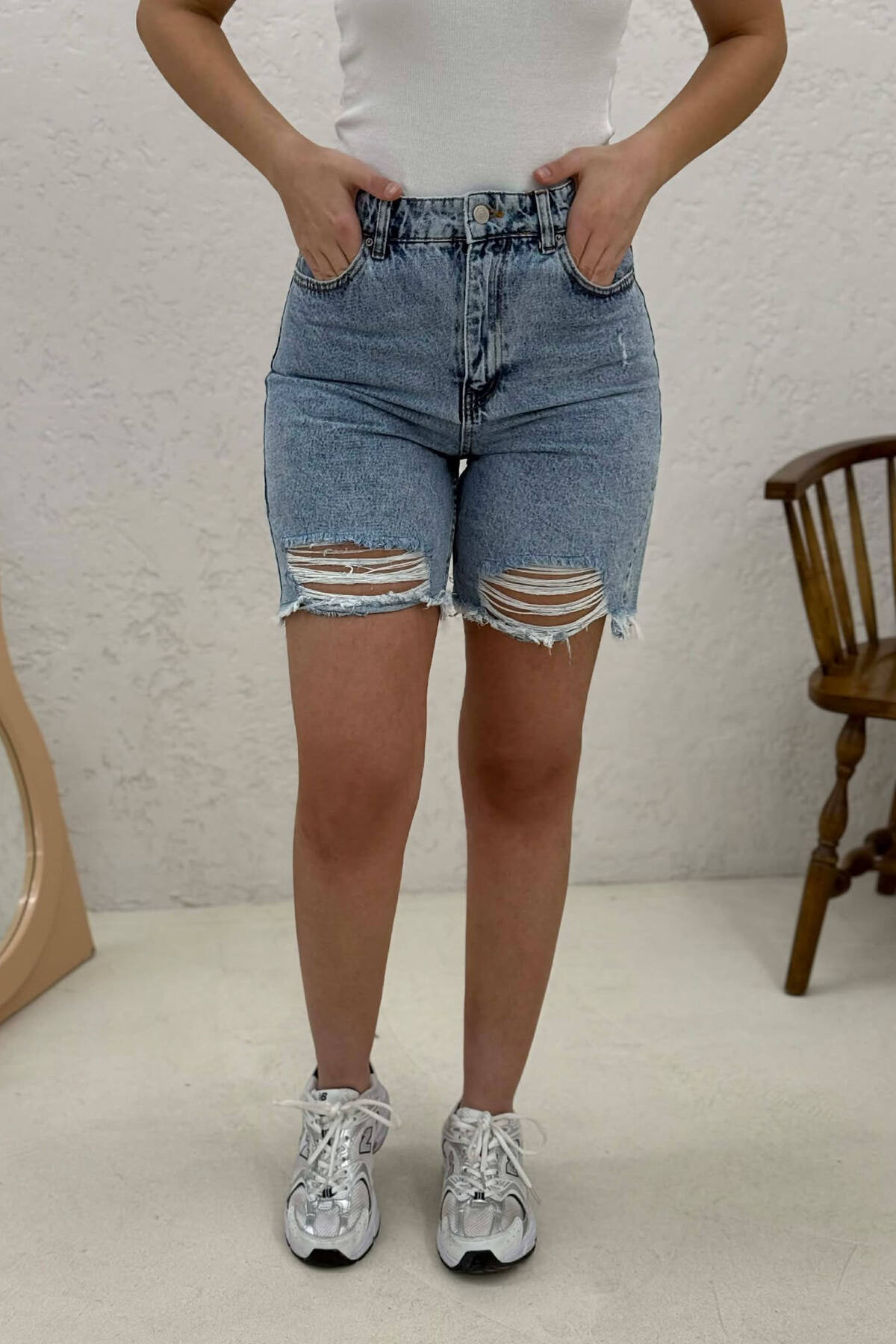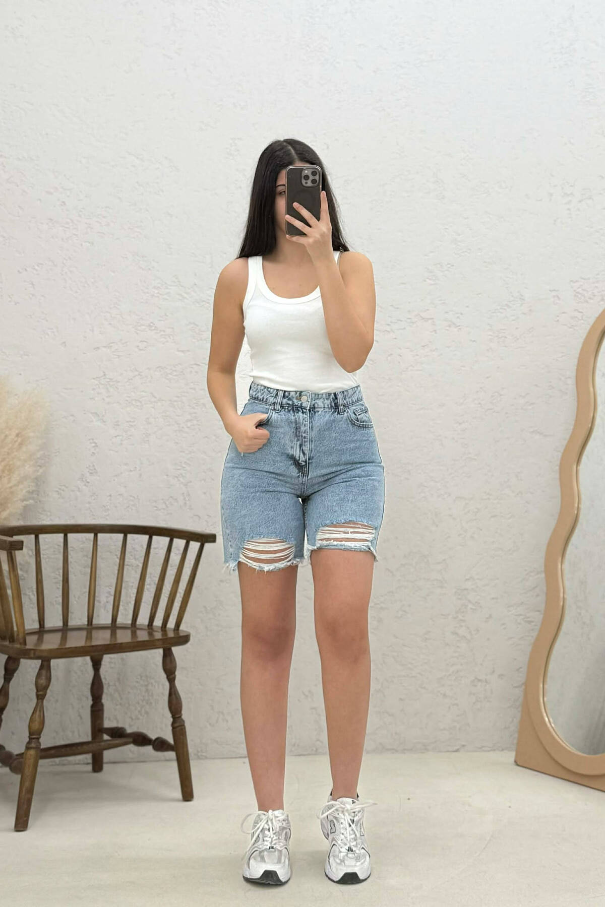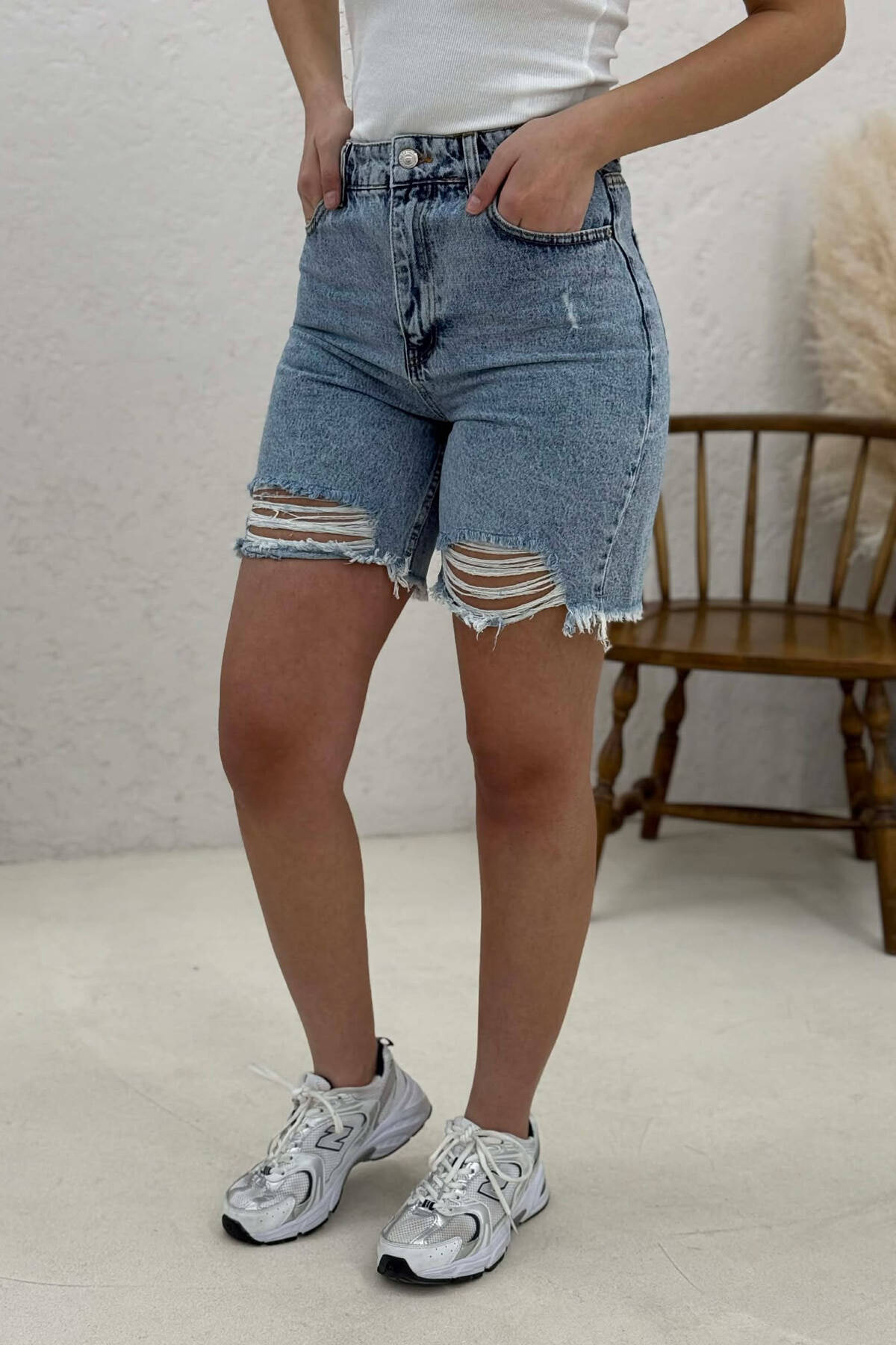 RIPPED KNEE HIGH WAIST DENIM WOMAN SHORTS LIGHTBLUE/BZ