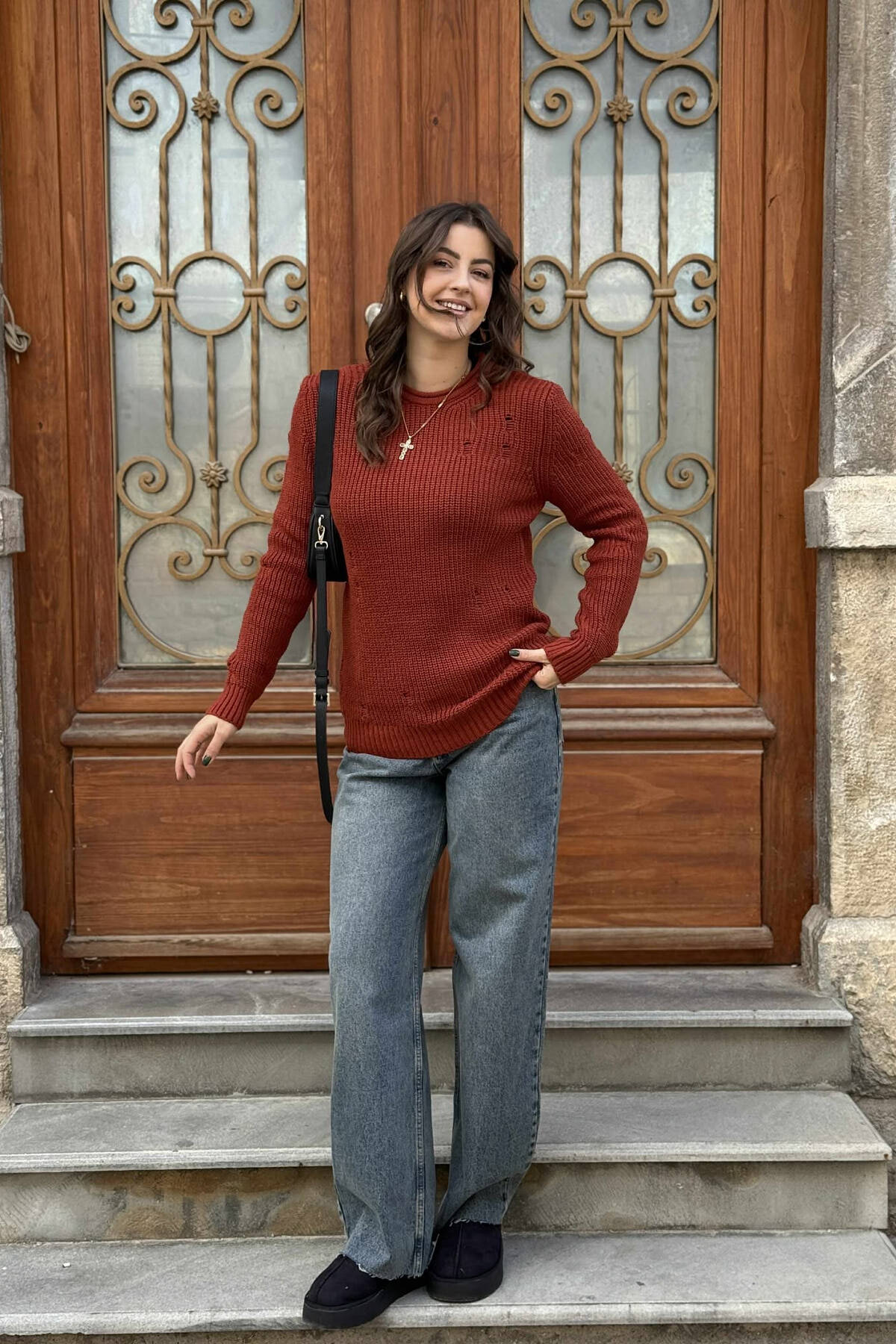 ROUND NECK KNITTED ONE COLOR WOMEN SWEATER BRICK/TULLE