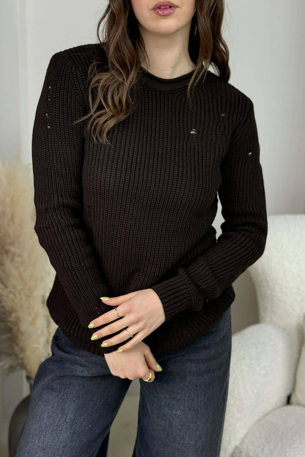 ROUND NECK KNITTED ONE COLOR WOMEN SWEATER DARK BROWN/KAE