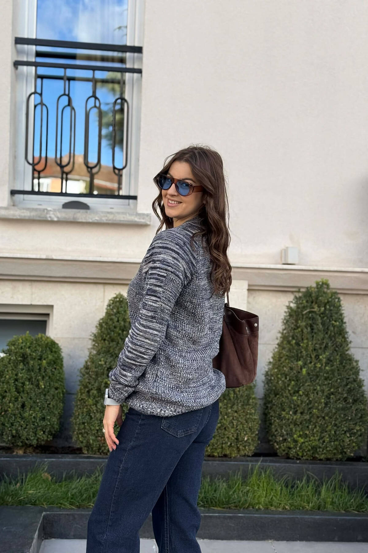 ROUND NECK KNITTED ONE COLOR WOMEN SWEATER DARK BROWN/KAE