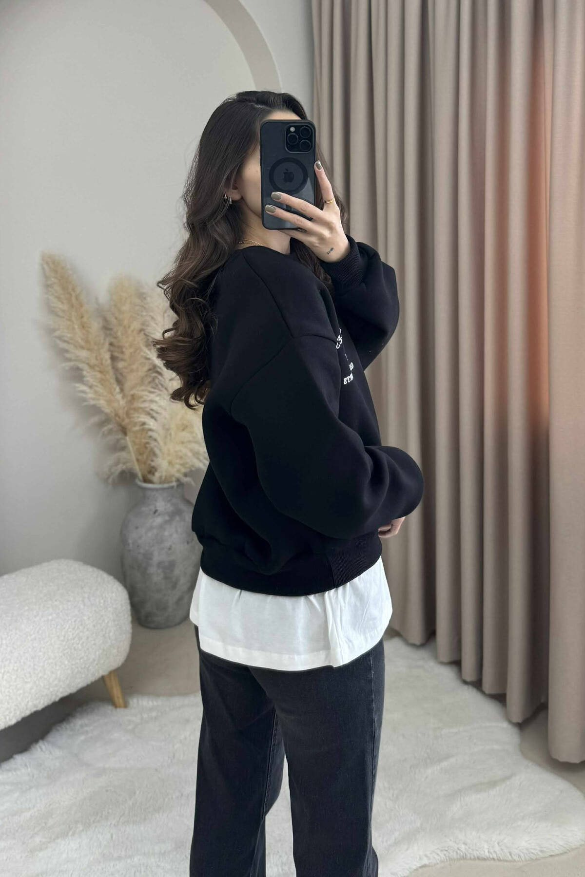 ONE COLOR FLUFFY SIMPLE WOMEN SWEATSHIRT BLACK/ E ZEZE