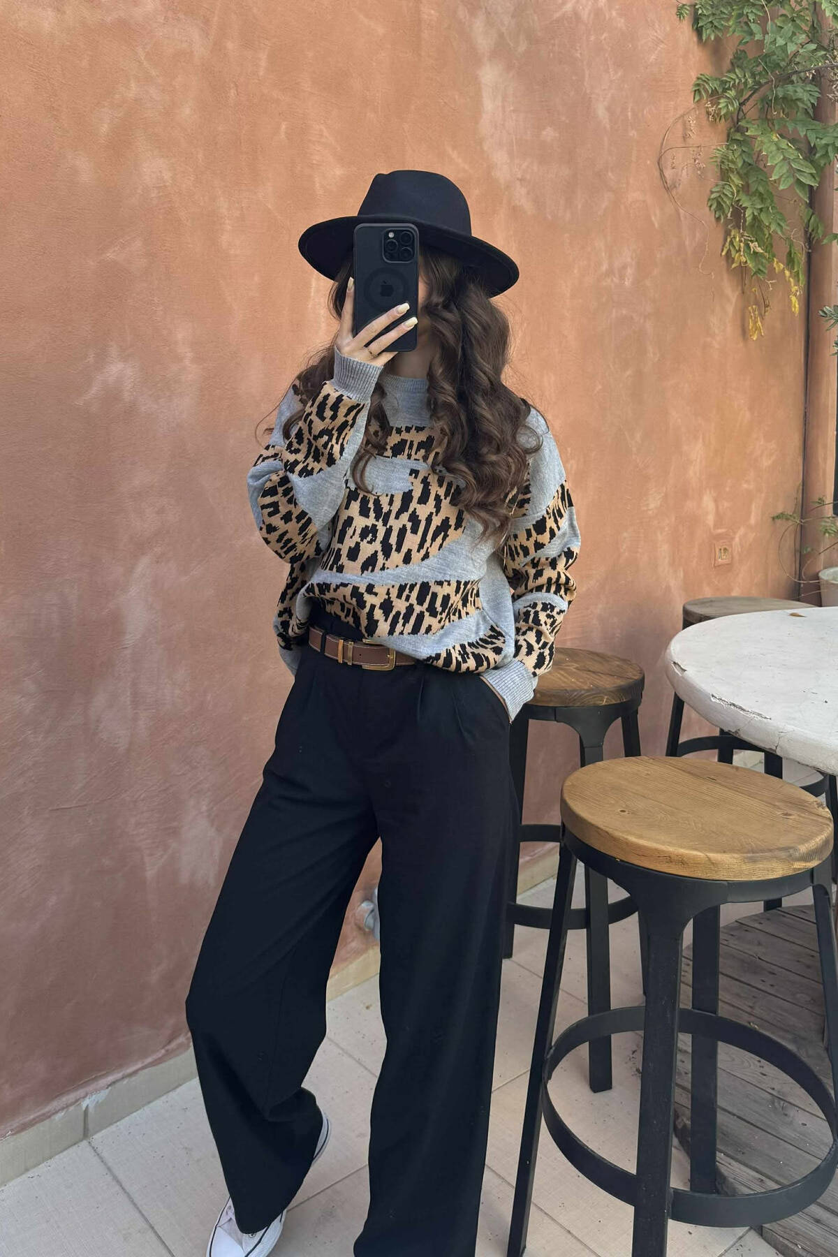 ROUND NECK LEO DESIGN WOMEN SWEATER GREY/GRI