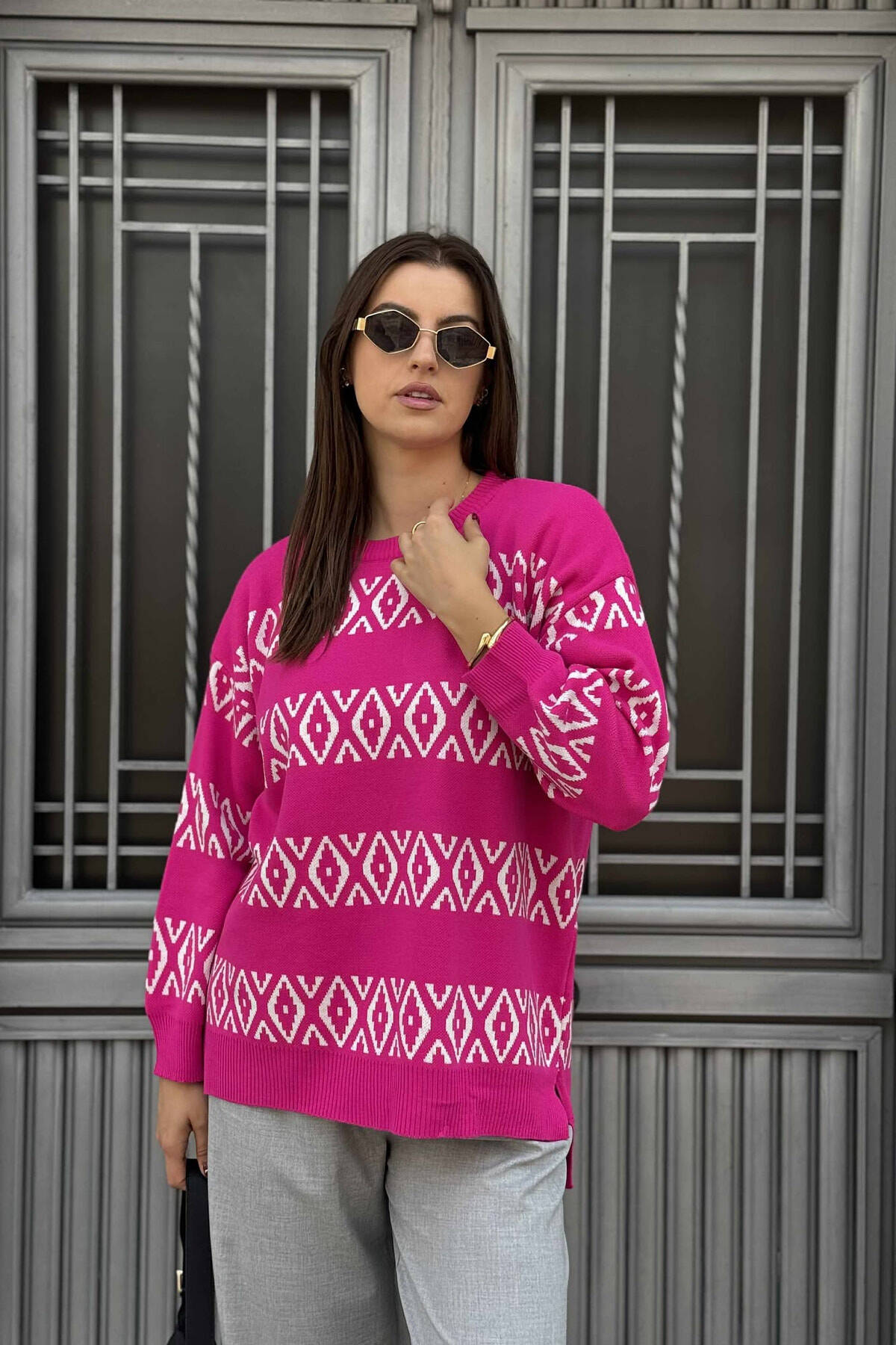 ROUND NECK RHOMBUS DESIGN WOMEN SWEATER FUCHSIA/CIKLAMI