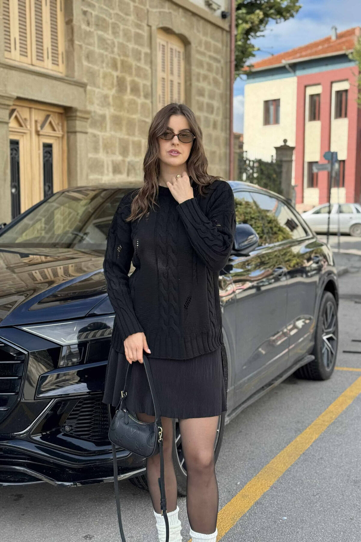 ROUND NECK RIPPED ONE COLOR WOMEN SWEATER BLACK/ E ZEZE