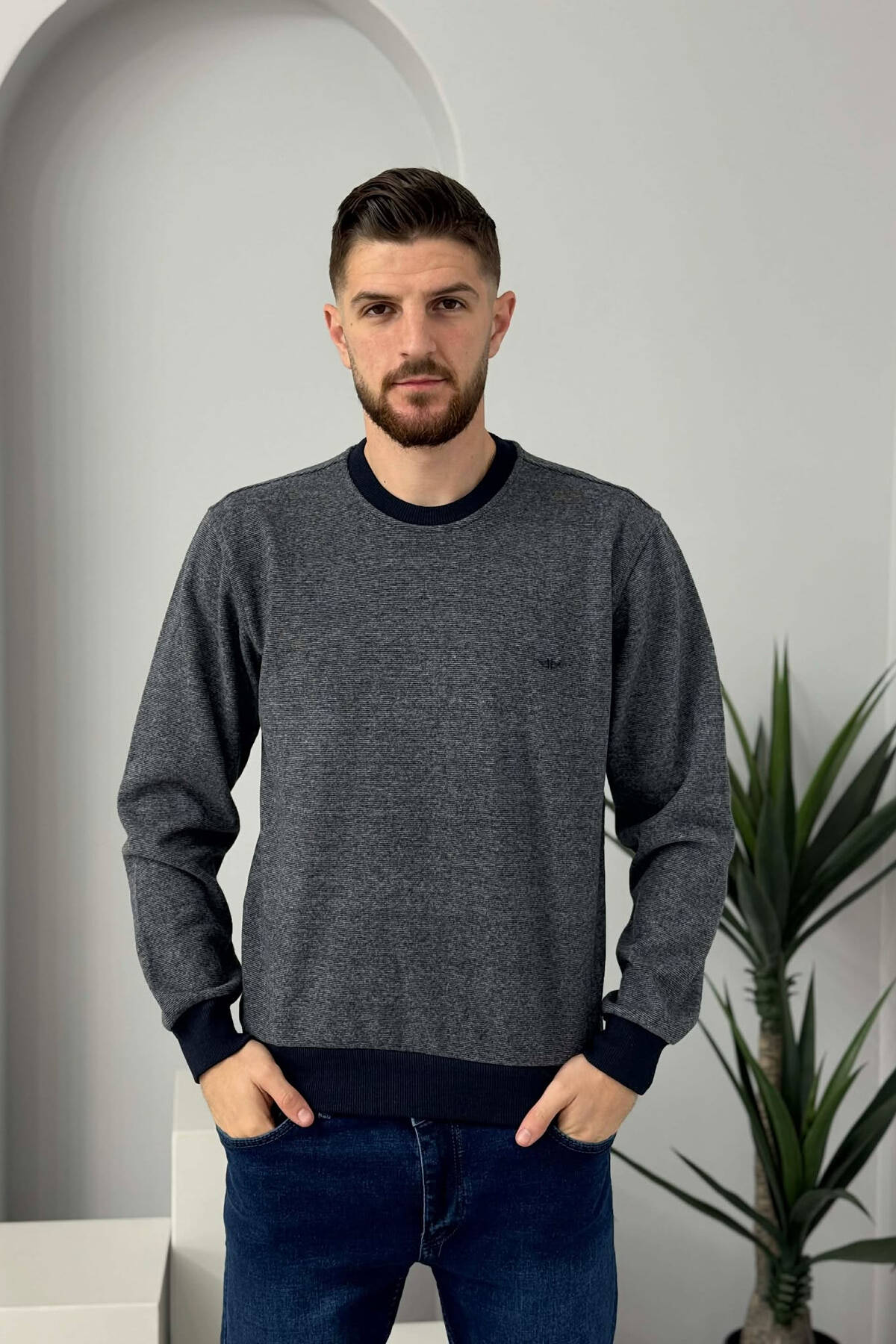 ROUND NECK SIMPLE MEN SWEATER DARK BLUE/BEE