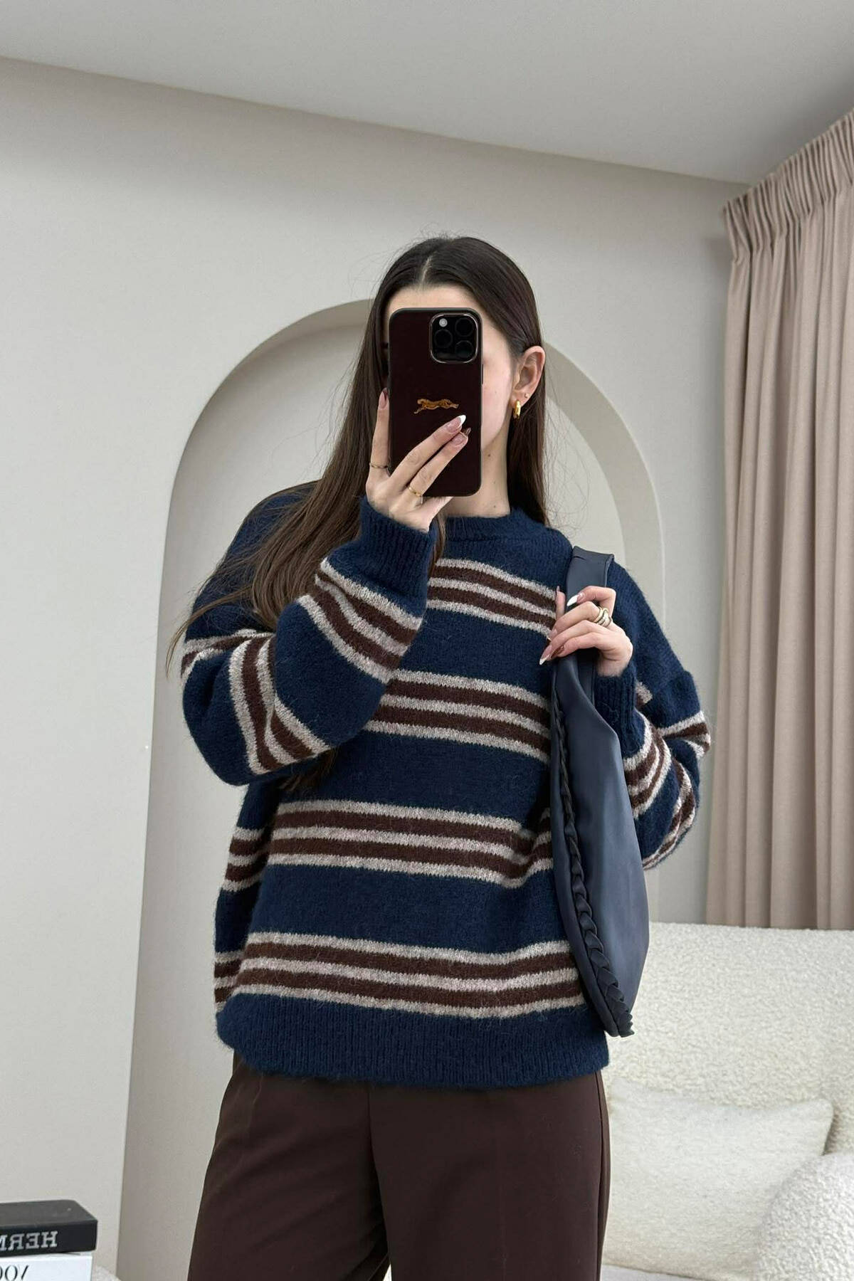 ROUND NECK STRIPE DESIGN WOMAN SWEATER DARK BLUE/BEE