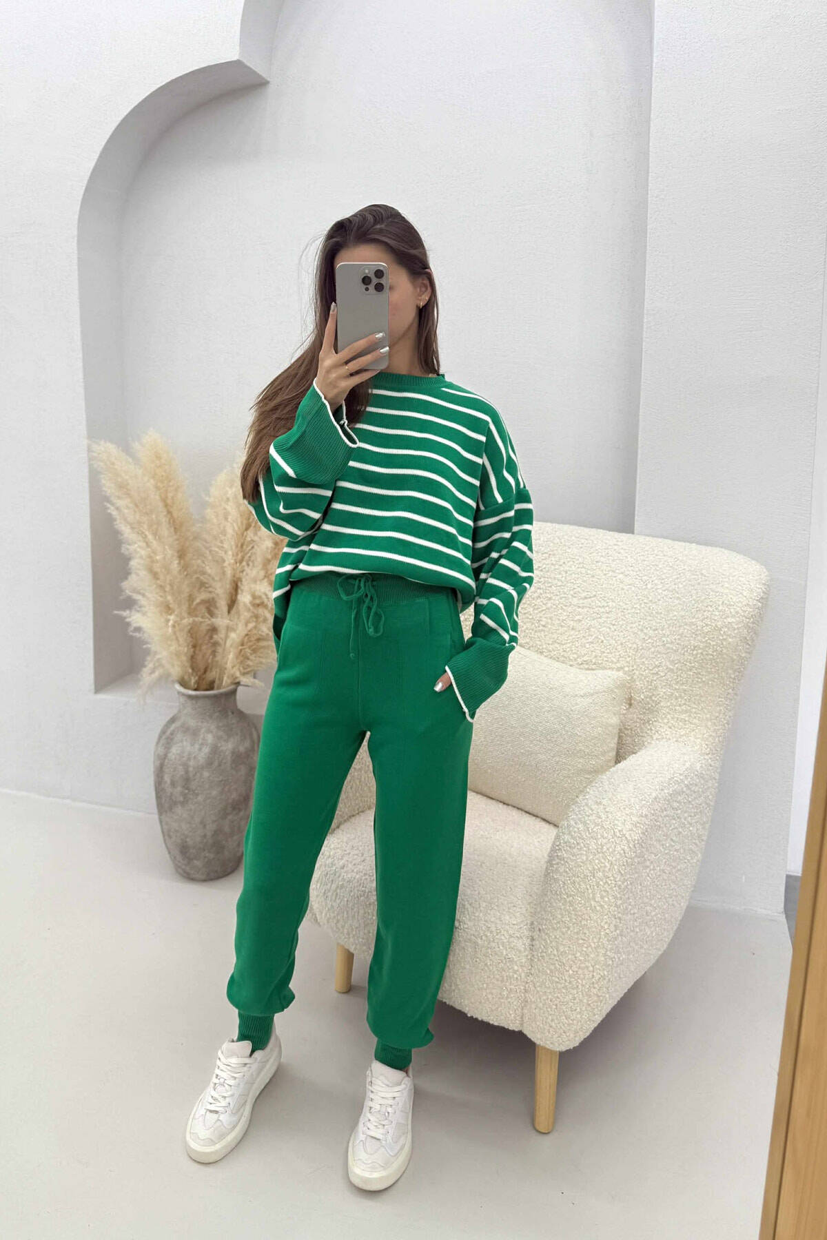ROUND NECK STRIPES SWEATER+TROUSERS KNIT WOMEN SET GREEN/JESHILE
