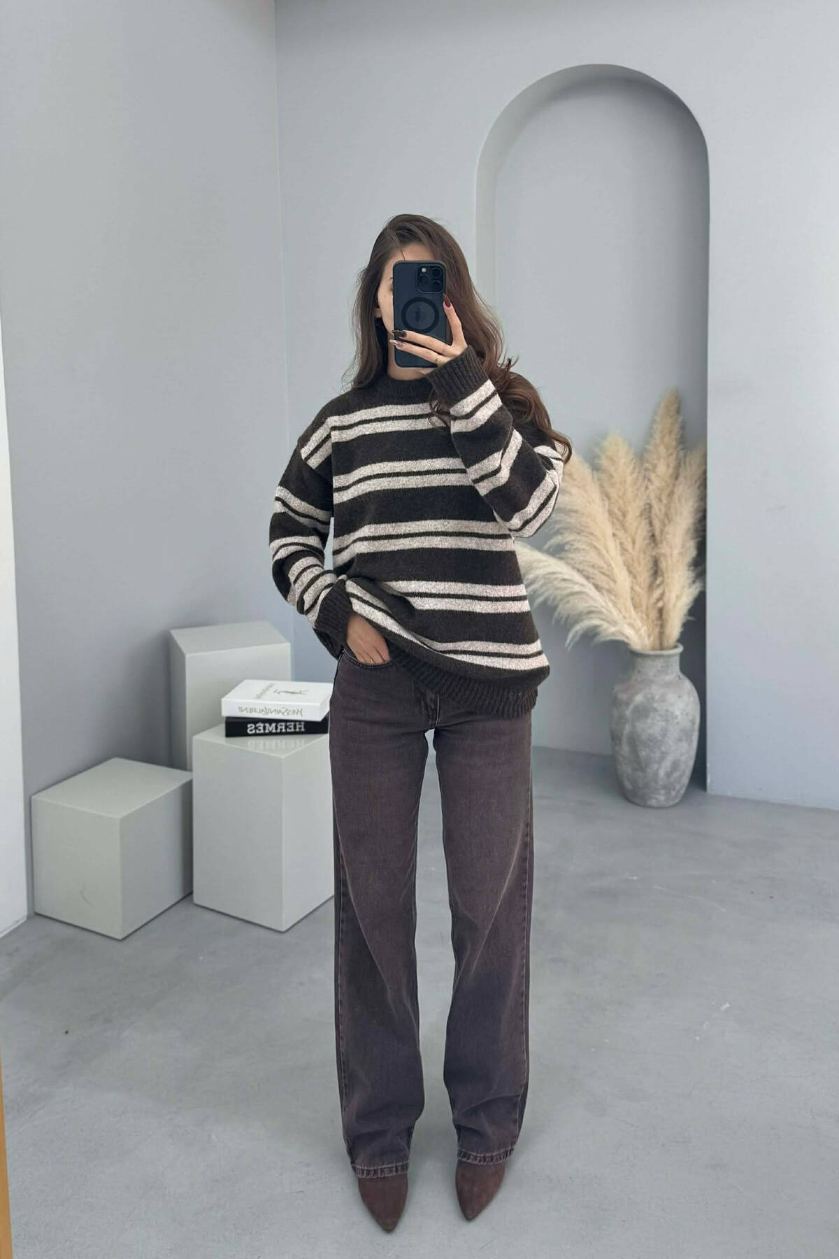 ROUND NECK STRIPED WOMEN SWEATER DARK BROWN/KAE
