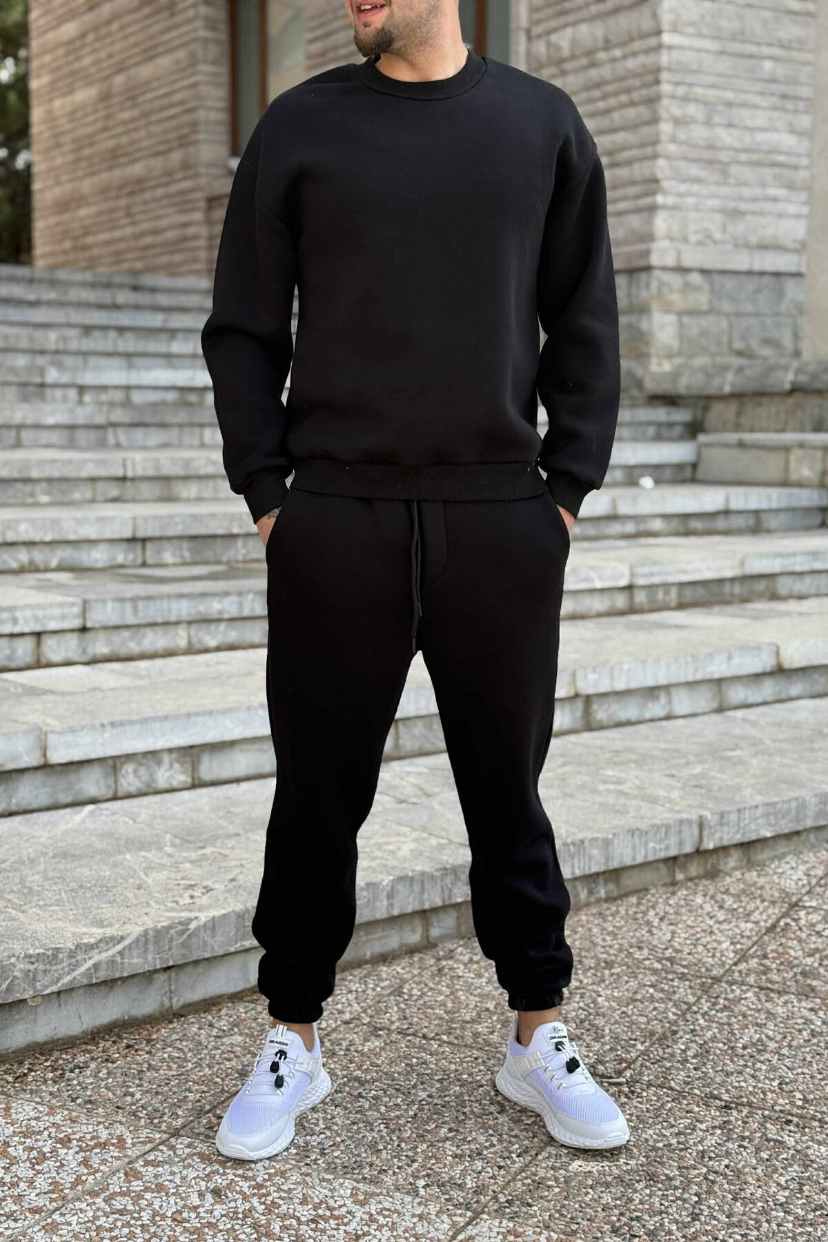 ROUND NECK SWEATSHIRT+JOGGERS FLUFFY MEN SET BLACK/ E ZEZE