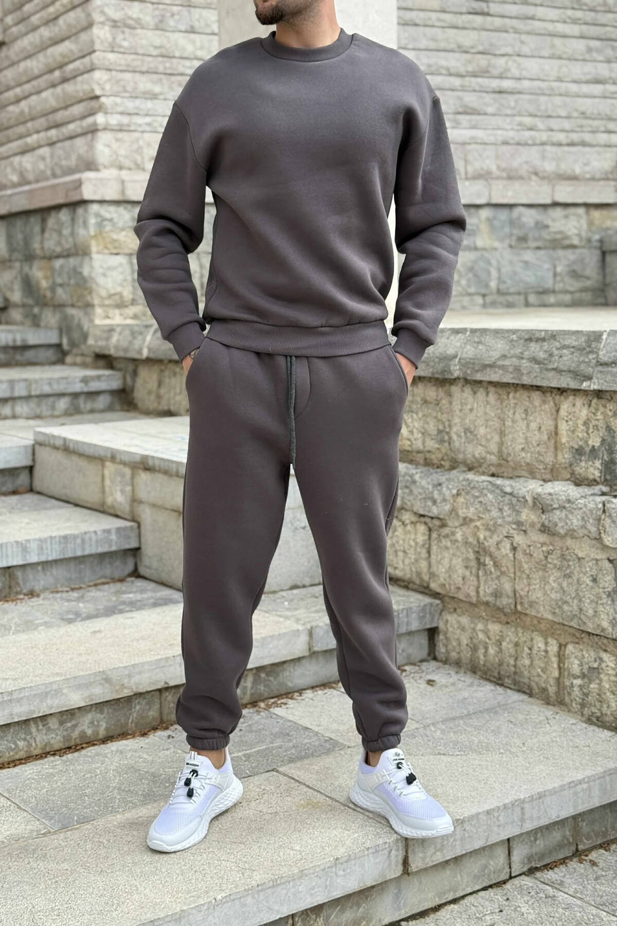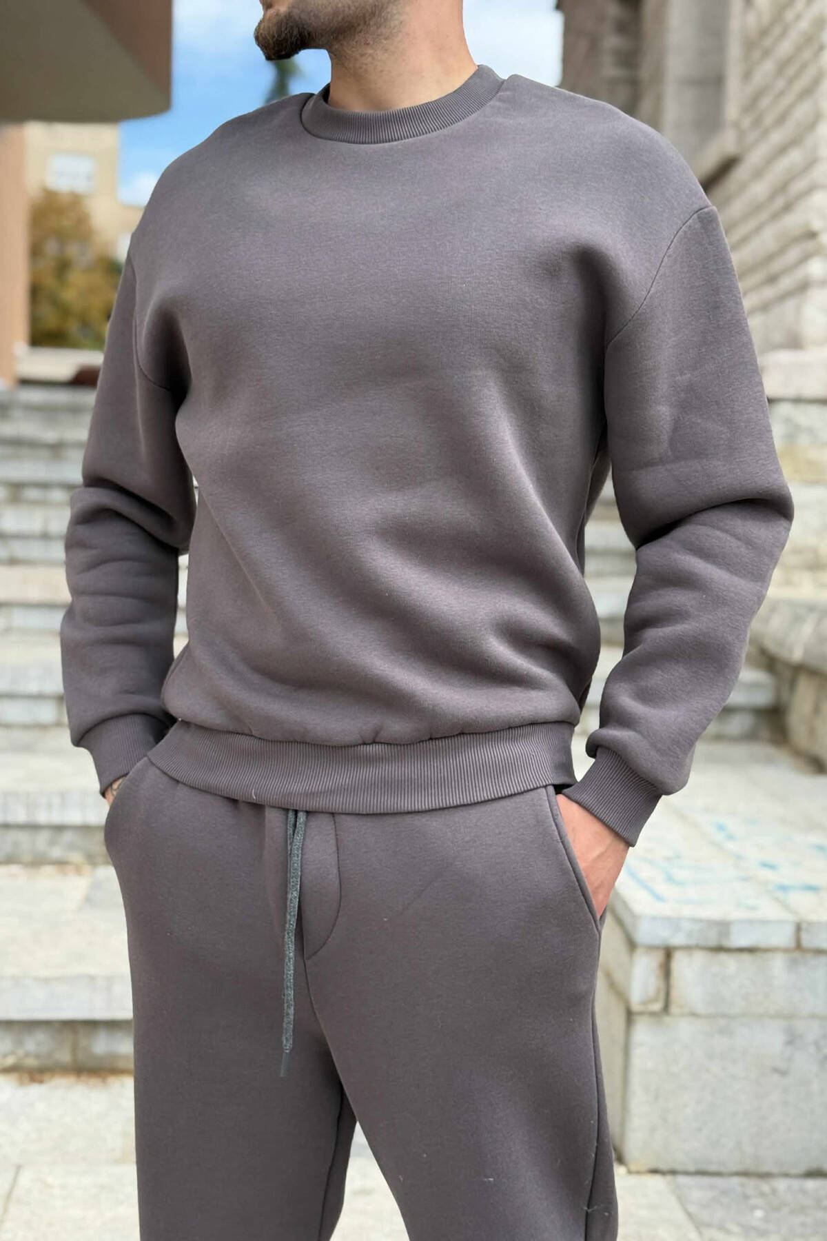 ROUND NECK SWEATSHIRT+JOGGERS FLUFFY MEN SET DARK GREY/GEE