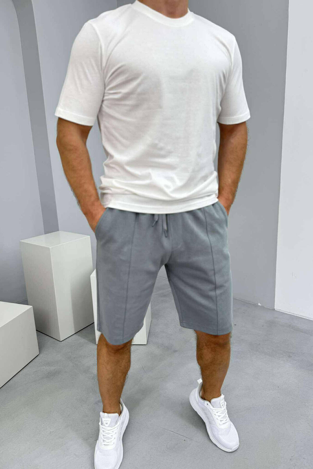 ROUND NECK T-SHIRT+SHORTS SIMPLE MEN SET WHITE-DARK GREY/BAGE