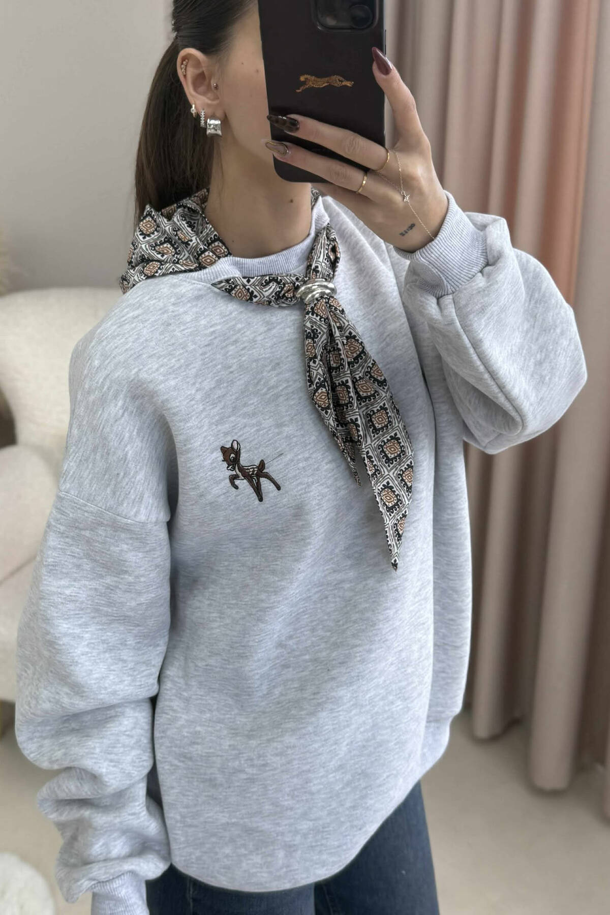 SCARF DETAIL DEER IMAGE FLUFFY WOMEN SWEATSHIRT LIGHT GREY/GZ