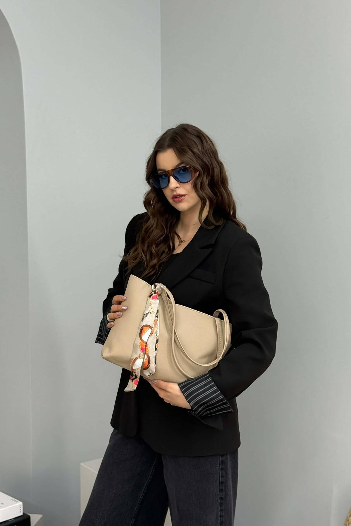 SCARF DETAIL ONE COLOR SIMPLE WOMEN BAG CREAM/KREM