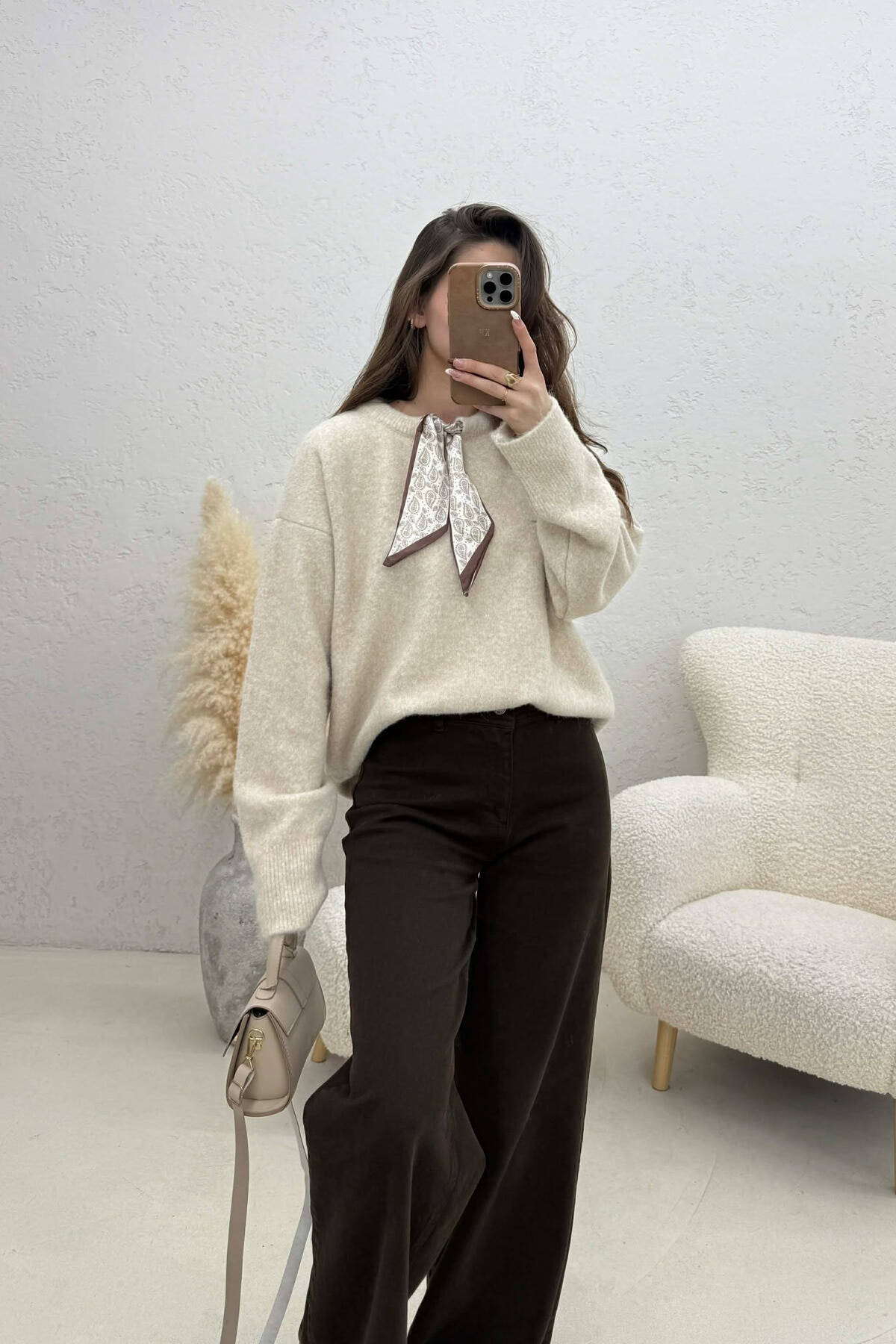 SCARF DETAIL ONE COLOR WOMEN SWEATER BEIGE/BEZHE