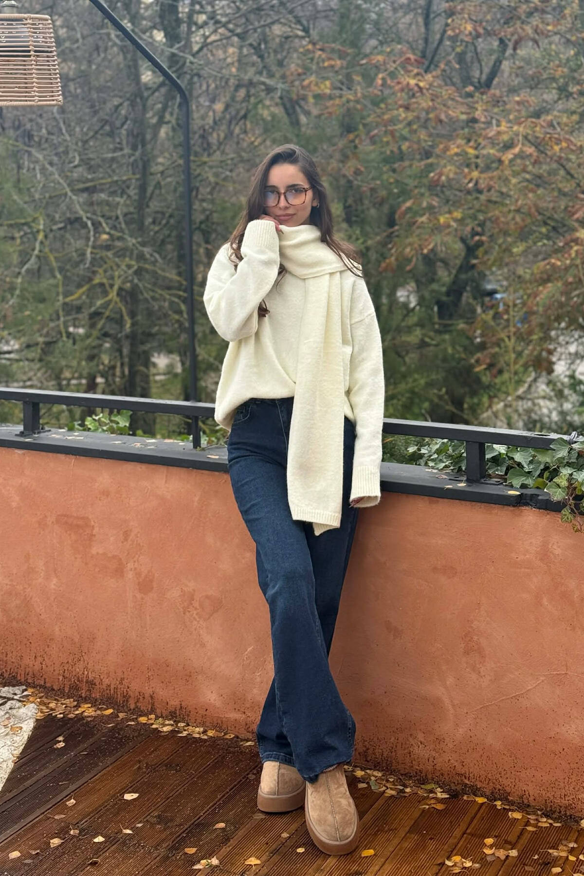 SCARF DETAIL ONE COLOR WOMEN SWEATER CREAM/KREM