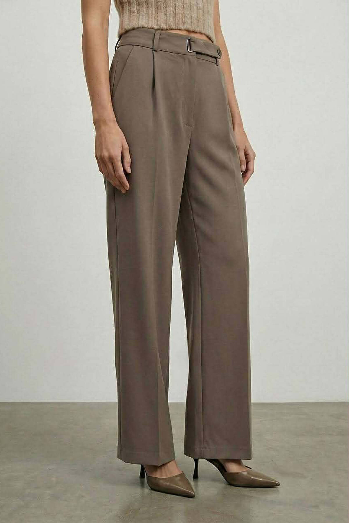 ONE COLOR BELT DETAIL WOMEN TROUSERS BROWN/KAFE