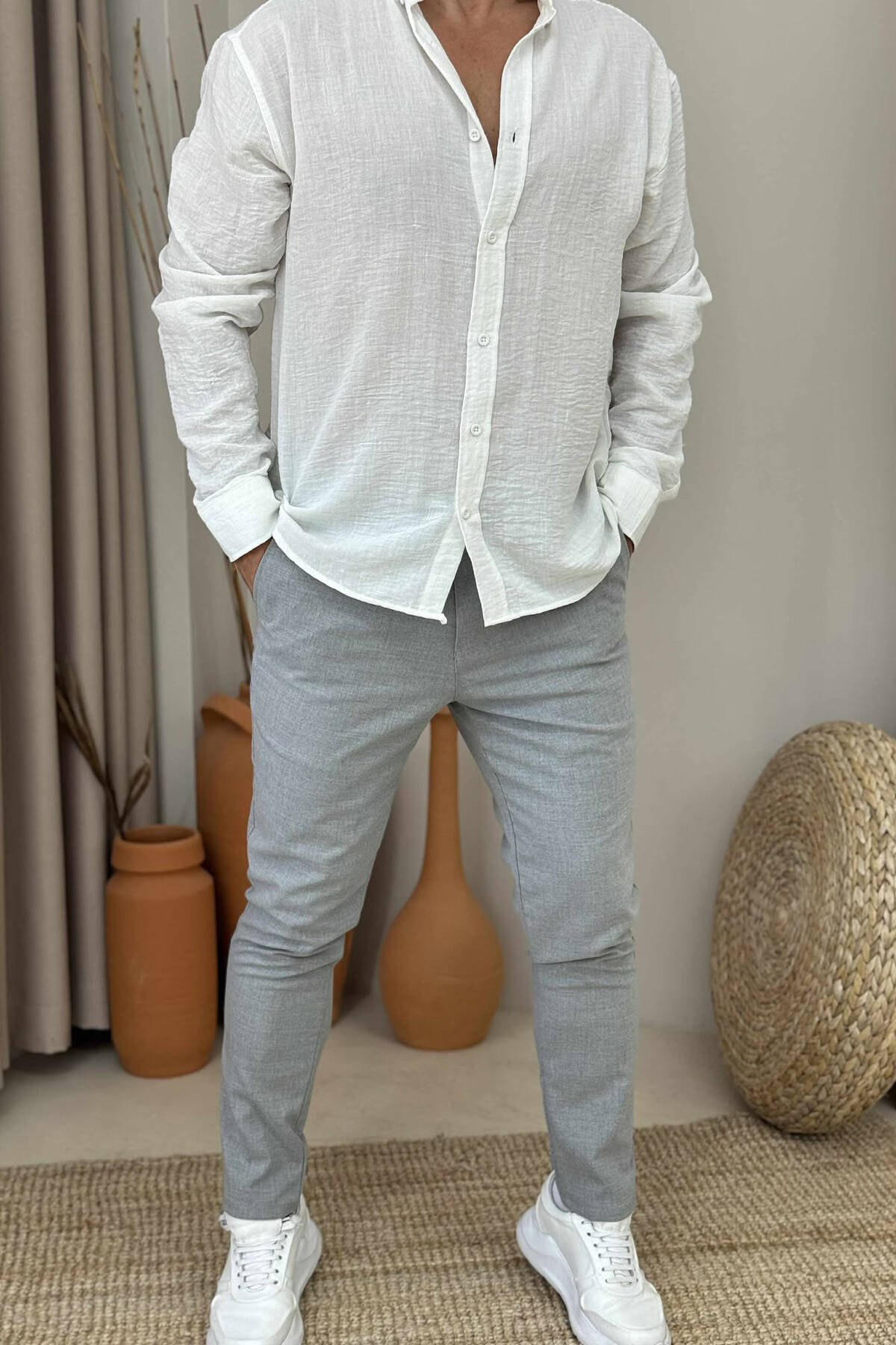 SEMI ELASTIC WAIST ONE COLOR MEN PANTS LIGHT GREY/GZ