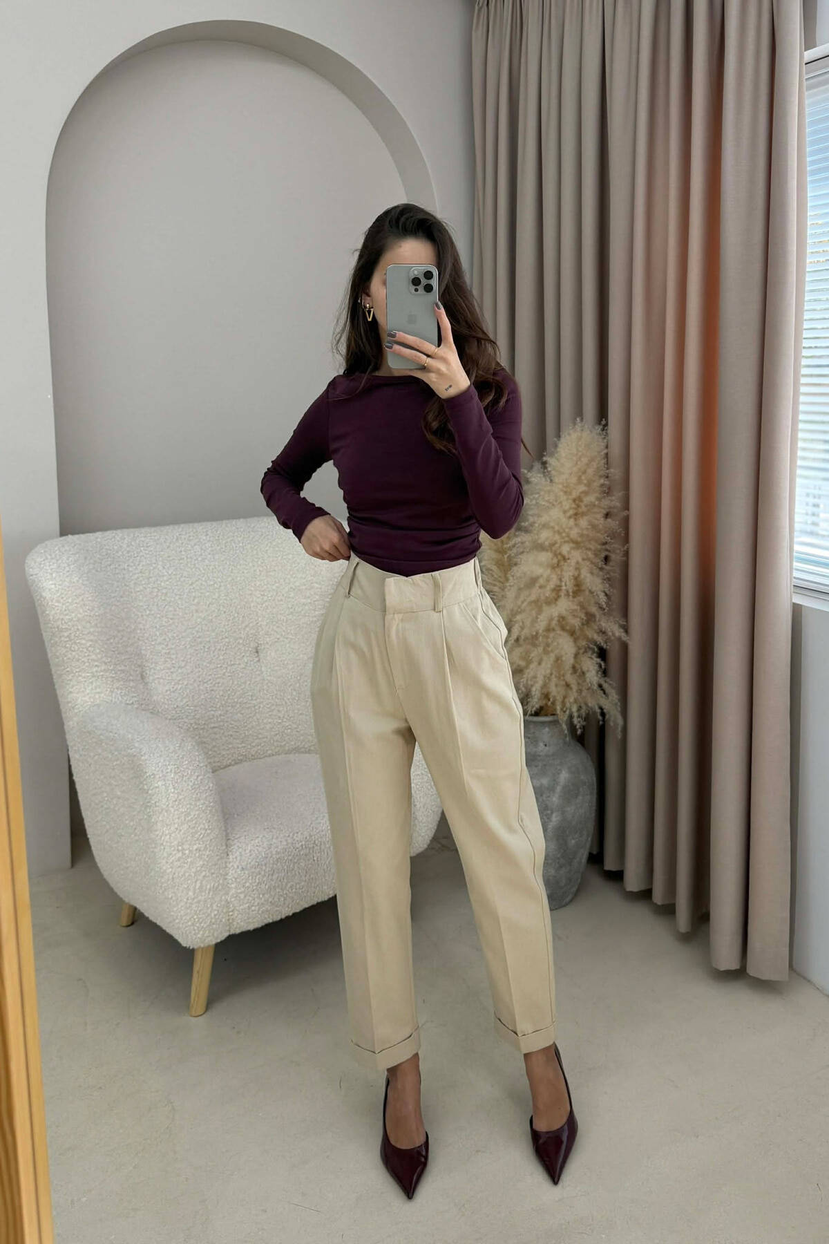 SEMI ELASTIC WAIST ONE COLOR WOMEN TROUSERS BEIGE/BEZHE