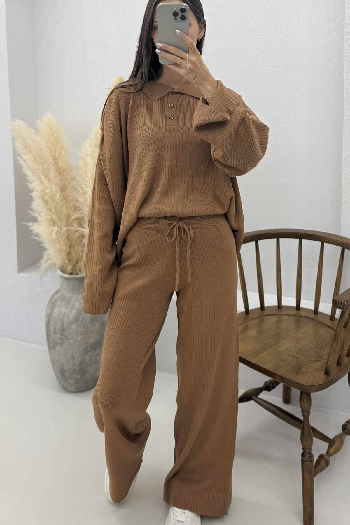 SET I THURRUR NJË NGJYRËSH TRIKO ME JAKË POLO+PANTALLONA PËR FEMRA NË NGJYRË KAFE