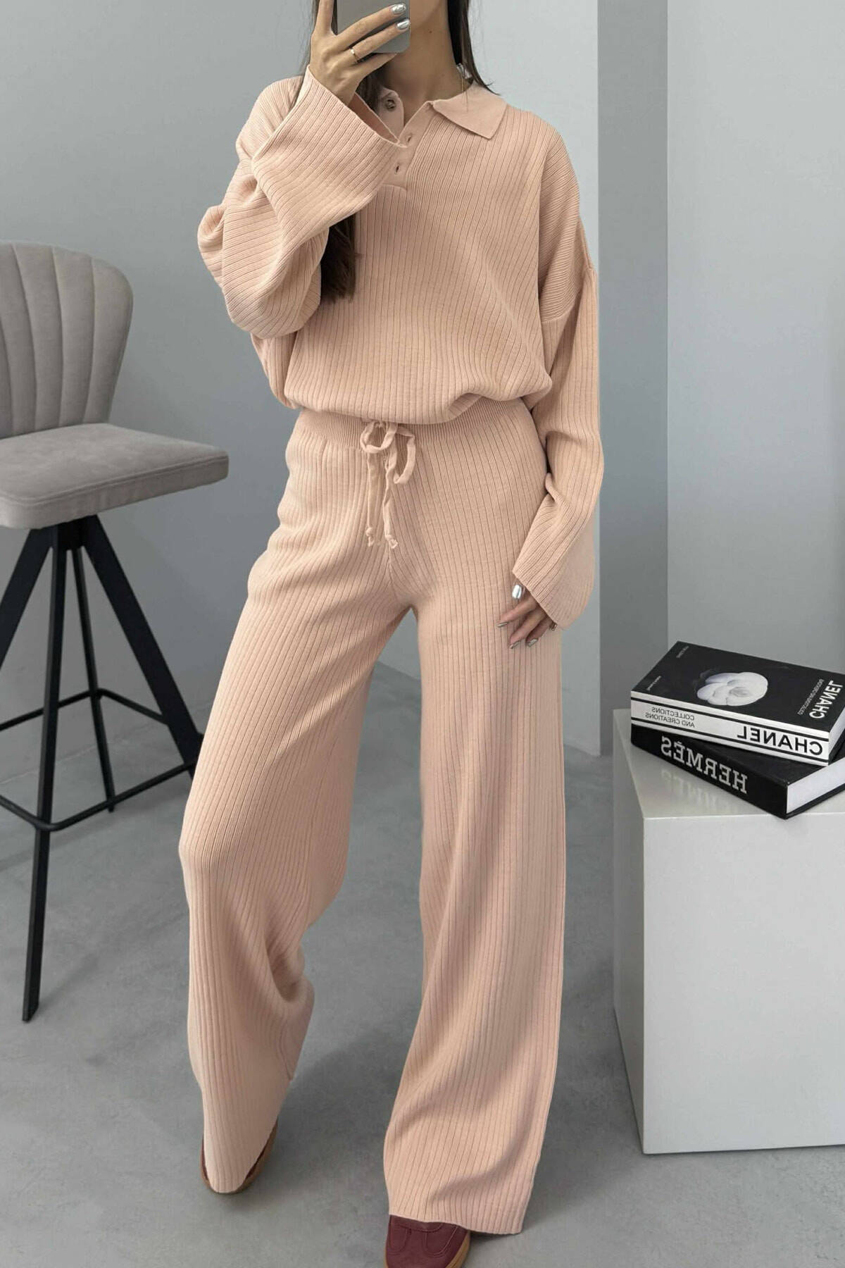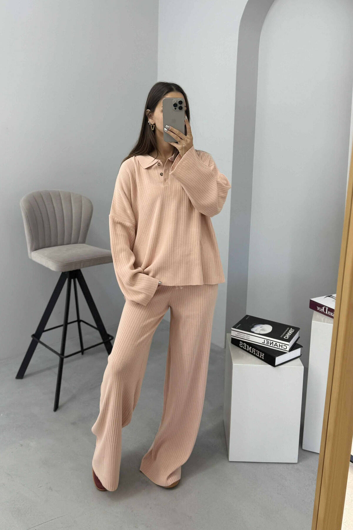 SET I THURRUR NJË NGJYRËSH TRIKO ME JAKË POLO+PANTALLONA PËR FEMRA NË NGJYRË PUDËR