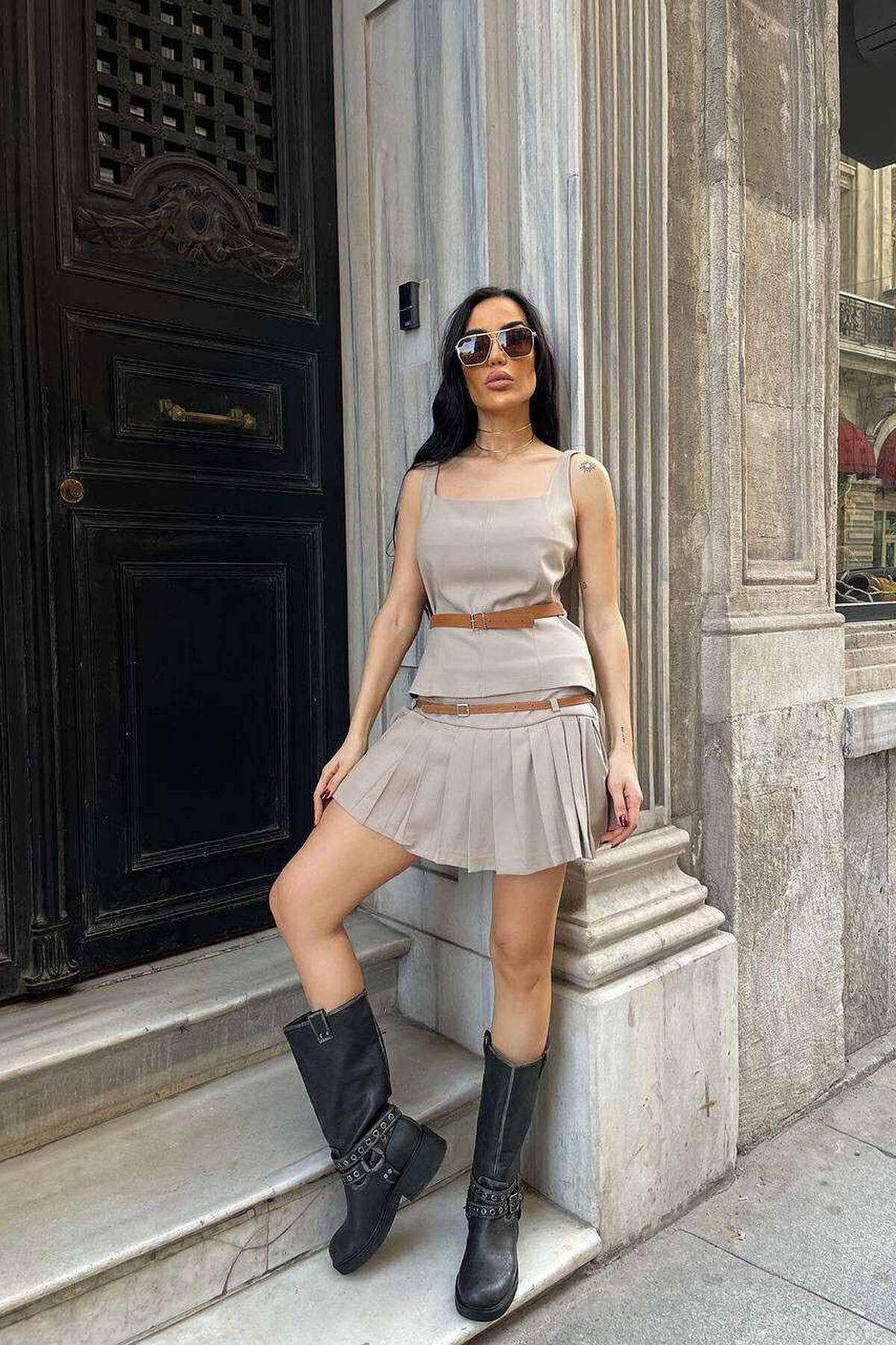 SET ME DETAJIN E RRIPIT KANATIERE+FUND-PANTALLONË PËR FEMRA NË NGJYRËN BEZHË