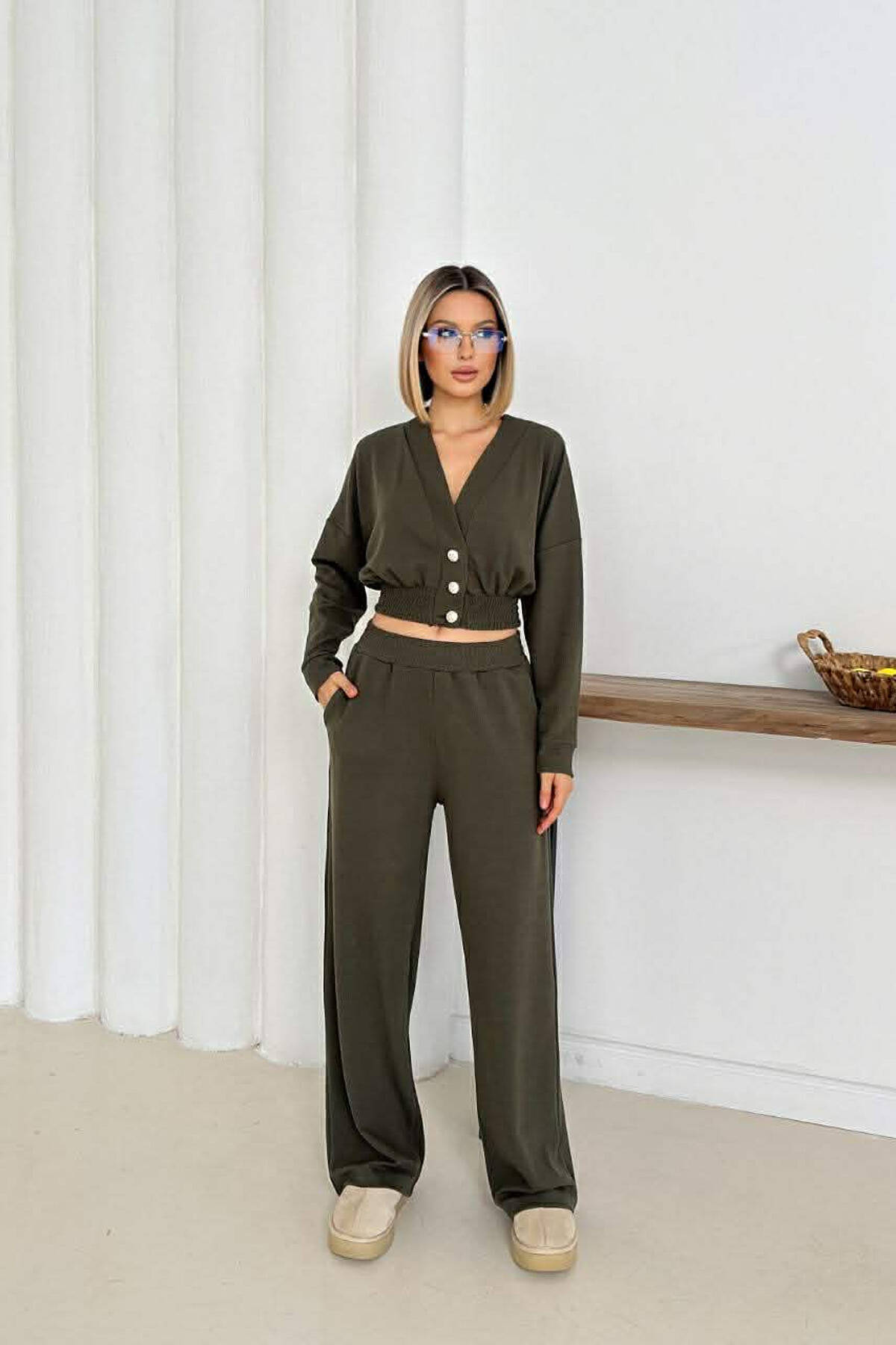 SET NJE NGJYRESH CROP TOP ME MENGE TE GJATA + PANTALLONA PER FEMRA NE NGJYRE JESHILE