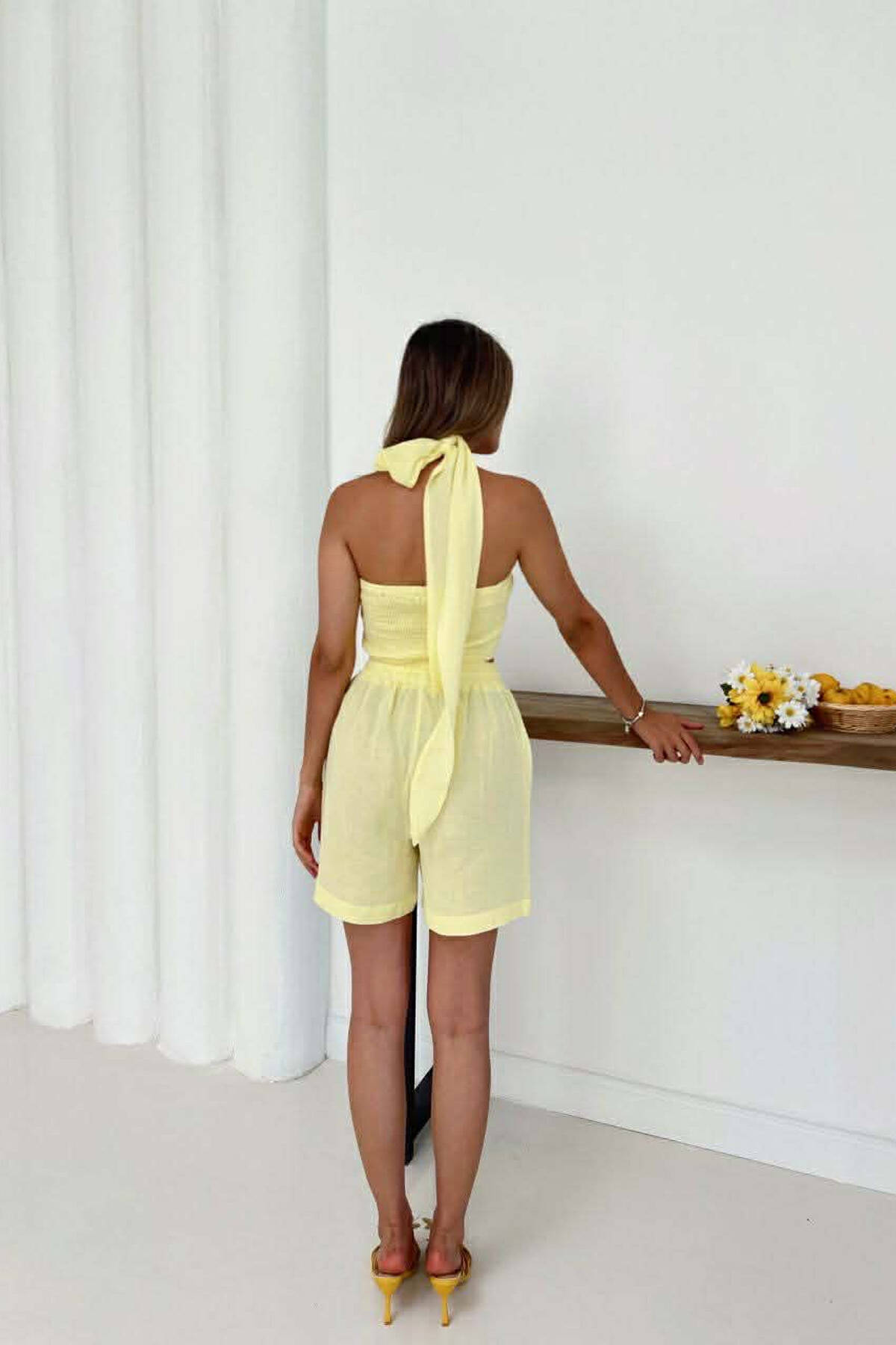 SET NJE NGJYRESH CROP TOP + PANTALLONA TE SHKURTRA PER FEMRA NE NGJYRE TE VERDHE