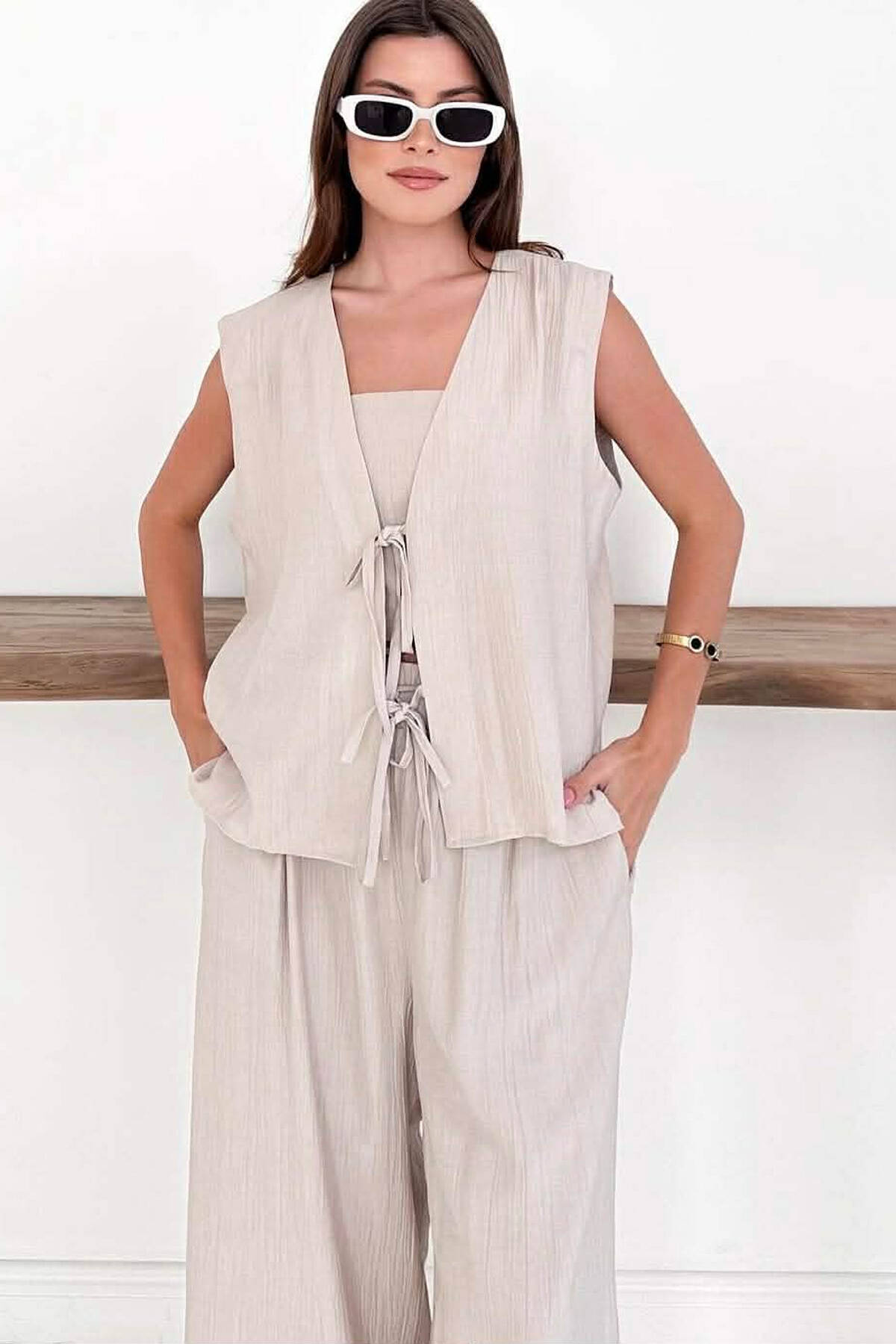 SET NJE NGJYRESH JELEK ME LIDHESE + CROP TOP + PANTALLONA PER FEMRA NE NGJYRE BEZHE