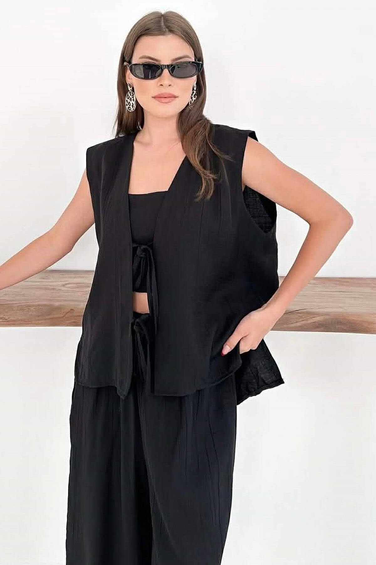 SET NJE NGJYRESH JELEK ME LIDHESE + CROP TOP + PANTALLONA PER FEMRA NE NGJYRE TE ZEZE