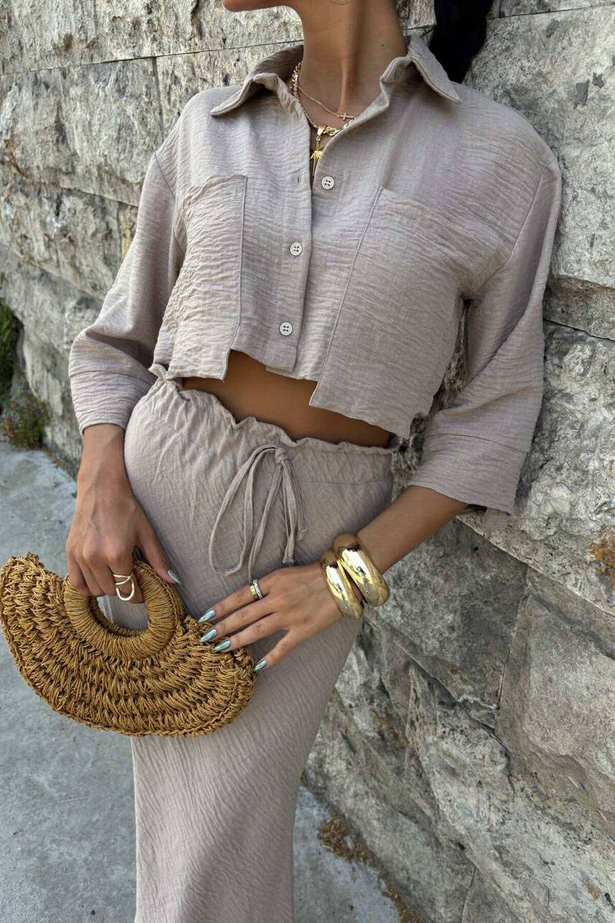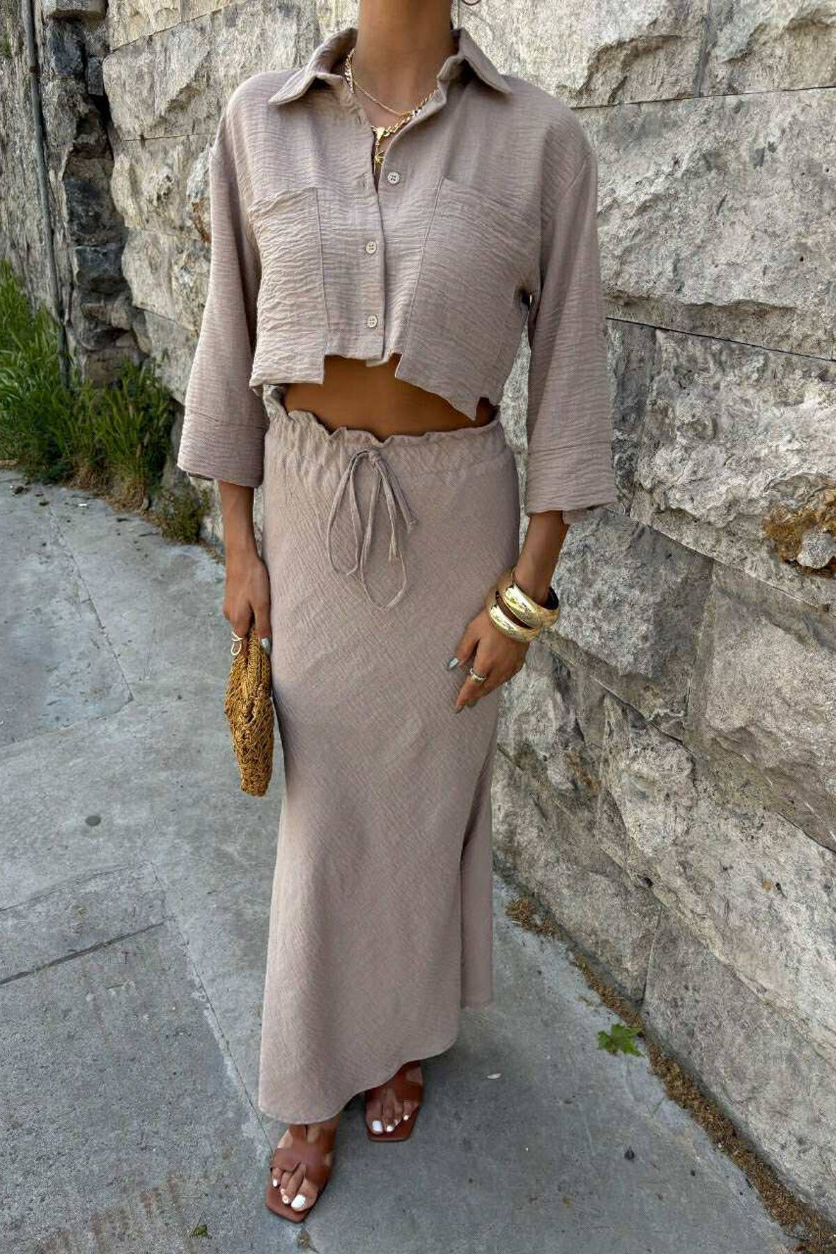 SET NJË NGJYRËSH KËMISHË+FUND PËR FEMRA NË NGJYRËN KAFE E ZBARDHUR